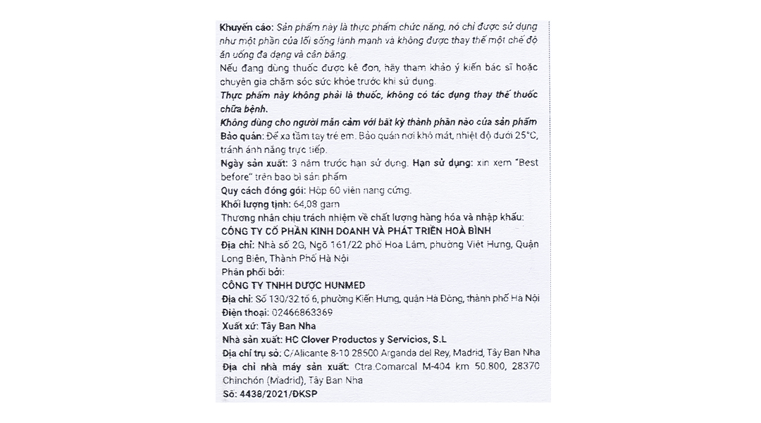 Thành phần khác: Maltodextrin, gelatin, chất chống đông vón (Magnesium của axit béo), chất ổn định (Silicon dioxide), màu (titanium dioxide).
