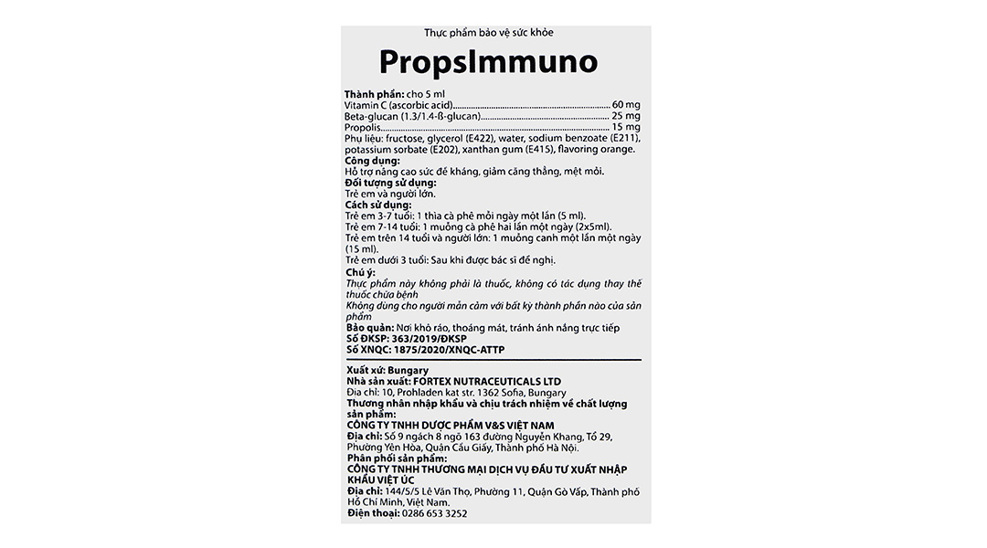 - Siro PropsImmuno là một giải pháp tuyệt vời giúp bạn duy trì sức khỏe mạnh mẽ, vượt qua mệt mỏi và căng thẳng, đặc biệt trong những thời điểm cơ thể cần hỗ trợ nhất. Với công thức kết hợp Vitamin C, Beta-glucan và Keo ong, sản phẩm không chỉ giúp nâng cao sức đề kháng mà còn bảo vệ cơ thể khỏi các yếu tố gây bệnh từ môi trường bên ngoài. Vitamin C, nổi tiếng với khả năng tăng cường hệ miễn dịch và bảo vệ tế bào khỏi sự tấn công của các gốc tự do, sẽ giúp bạn luôn cảm thấy khỏe mạnh và tràn đầy năng lượng. Beta-glucan, một hợp chất tự nhiên có khả năng kích thích và củng cố sức mạnh của hệ thống miễn dịch, giúp cơ thể bạn chủ động phòng ngừa và chống lại các tác nhân gây hại. Keo ong, một sản phẩm quý giá từ thiên nhiên, với các đặc tính kháng khuẩn, kháng viêm, sẽ hỗ trợ cơ thể trong việc phục hồi nhanh chóng và duy trì sức khỏe tối ưu.