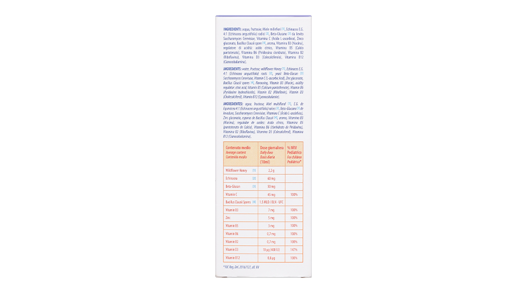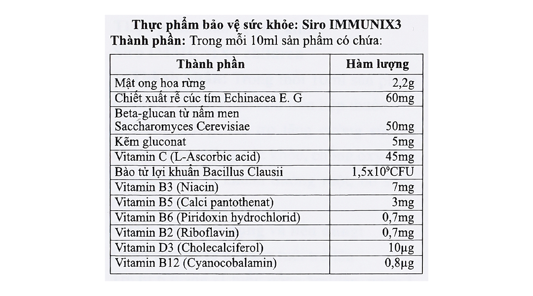 Hoạt chấtBào tử lợi khuẩn Bacillus Clausii, Kẽm gluconat, Vitamin B6 (Piridoxin hydrochlorid), Mật ong hoa rừng, Beta-glucan từ nấm men Saccharomyces Cerevisiae, Vitamin C (L-Ascorbic acid), Vitamin B3 (Niacin), Vitamin B12 (Cyanocobalamin), Vitamin B2 (Riboflavin), Vitamin B5 (Calci pantothenat), Vitamin D3 (Cholecalciferol)
