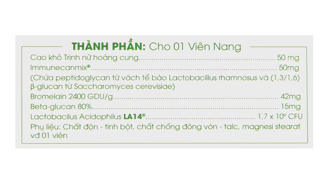 (Chứa peptidoglycan từ vách tế bào Lactobacillus rhamnosus và (1,3/1,6) β-glucan từ Saccharomyces cerevisiae)