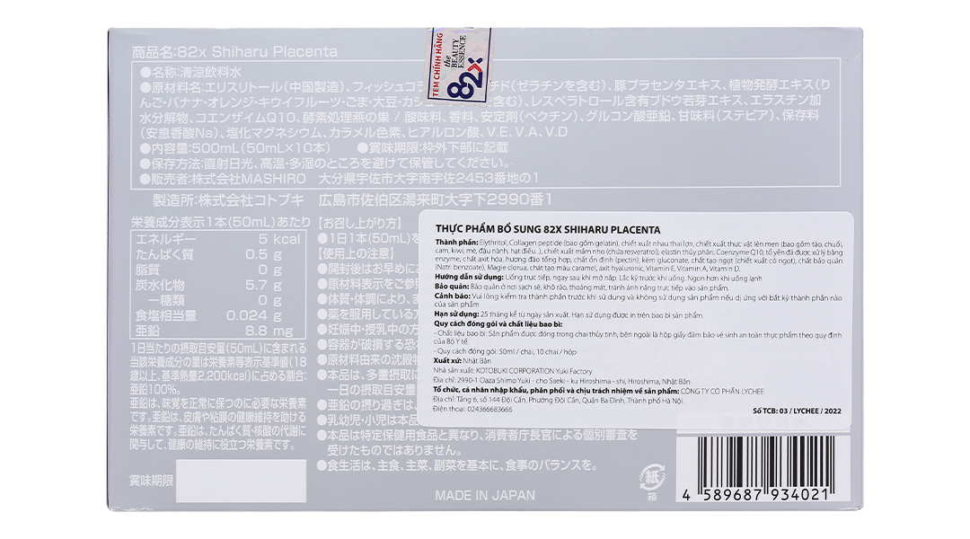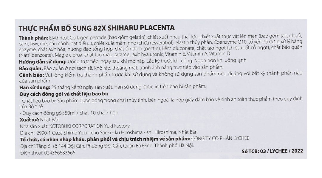Nước uống 82X Shiharu Placenta giúp cân bằng nội tiết tố hộp 10 chai x 50ml