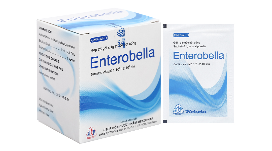 ENTEROBELLA chứa các bào tử Bacillus clausii bình thường sinh sống tại ruột mà không sinh bệnh. Bacillus clausii tồn tại trong sản phẩm ở trạng thái bào tử, nhờ vậy khi uống vào dạ dày nó không bị acid cũng như các men tiêu hóa ở dịch vị phá hủy, vào ống tiêu hóa và chuyển thành thể hoạt động giúp cân bằng hệ vi sinh đường ruột, sau khi sử dụng kháng sinh, nhất là kháng sinh phổ rộng. Đồng thời cũng góp phần khôi phục hệ vi sinh đường ruột đã bị thay đổi do nhiều nguồn gốc. Bacillus clausii có khả năng sản xuất một số vitamin, đặc biệt vitamin nhóm B, góp phần bổ sung vitamin thiếu hụt do việc dùng thuốc kháng sinh và hóa trị. Bacillus clausii giúp ENTEROBELLA có tính kháng nguyên không đặc hiệu và tác dụng giải độc gắn liền với các hoạt động chuyển hóa của Bacillus clausii. ENTEROBELLA đề kháng với các kháng sinh: penicillins, cephalosporins, tetracyclines, macrolides, aminoglycosides, novobiocin, chloramphenicol, thiamphenicol, lincomycin, isoniazid, cycloserine, rifampicin, acid nalidixic và acid pipemidic. Vì vậy tốt nhất nên uống xen kẽ vào giữa hai liều dùng kháng sinh.