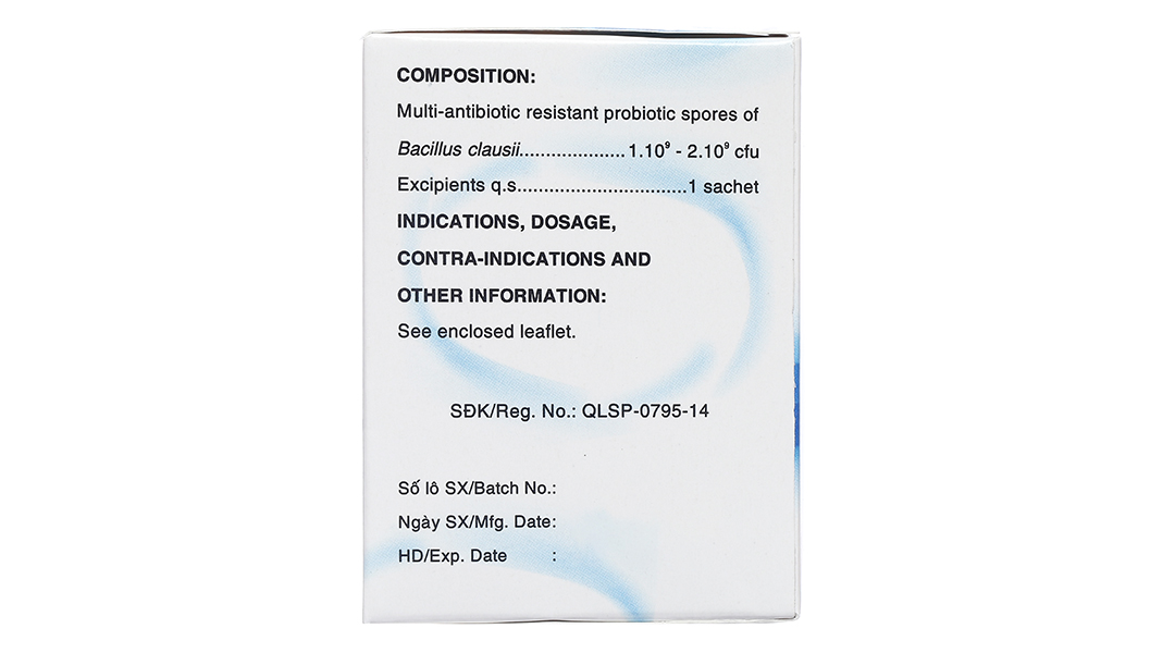 Hoạt chất: Bào tử kháng đa kháng sinh Bacillus clausii 1.109 – 2.109 CFU
