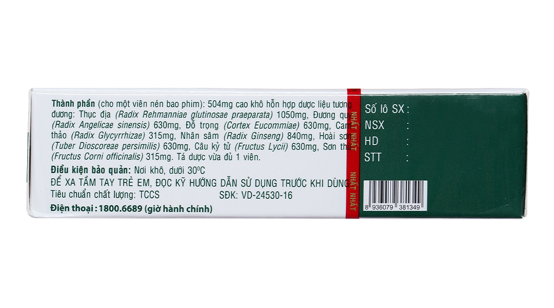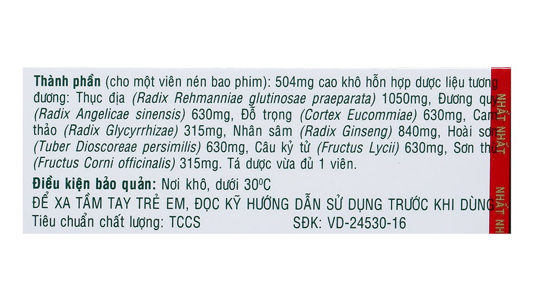 - Thành phần: (cho một viên nén bao phim) 504mg cao khô hỗn hợp dược liệu tương đương: Thục địa (Radix Rehmanniae glutinosae praeparata) 1050mg, Đương quy (Radix Angelicae sinensis) 630mg, Đỗ trọng (Cortex Eucommiae) 630mg, Cam thảo (Radix Glycyrrhizae) 315mg, Nhân sâm (Radix Ginseng) 840mg, Hoài sơn (Tuber Dioscoreae persimilis) 630mg, Câu kỷ tử (Fructus Lycii) 630mg, Sơn thù (Fructus Corni officinalis) 315mg.