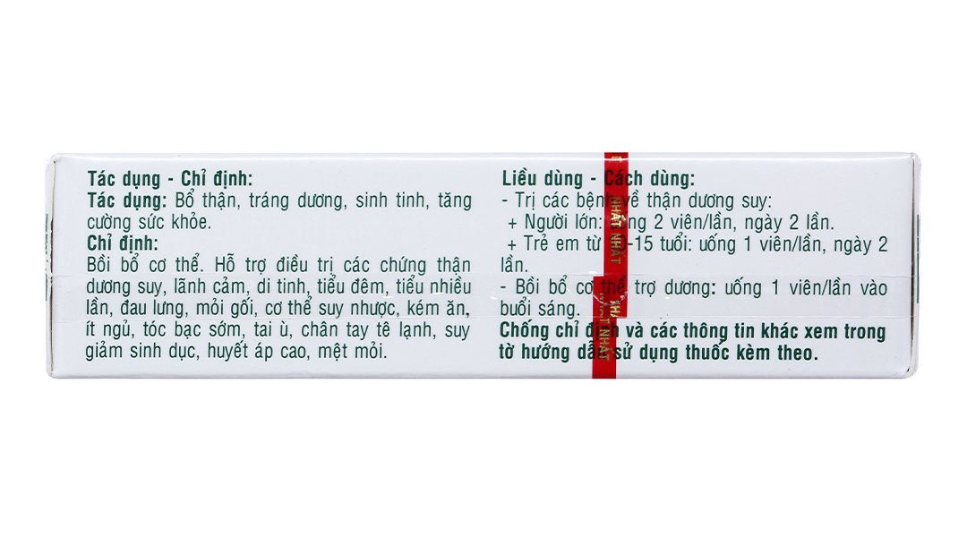 - Chỉ định: Bồi bổ cơ thể. Hỗ trợ điều trị các chứng thận dương suy, lãnh cảm, di tinh, tiểu đêm, tiểu nhiều lần, đau lưng, mỏi gối, cơ thể suy nhược, kém ăn, ít ngủ, tóc bạc sớm, tai ù, chân tay tê lạnh, suy giảm sinh dục, huyết áp cao, mệt mỏi.