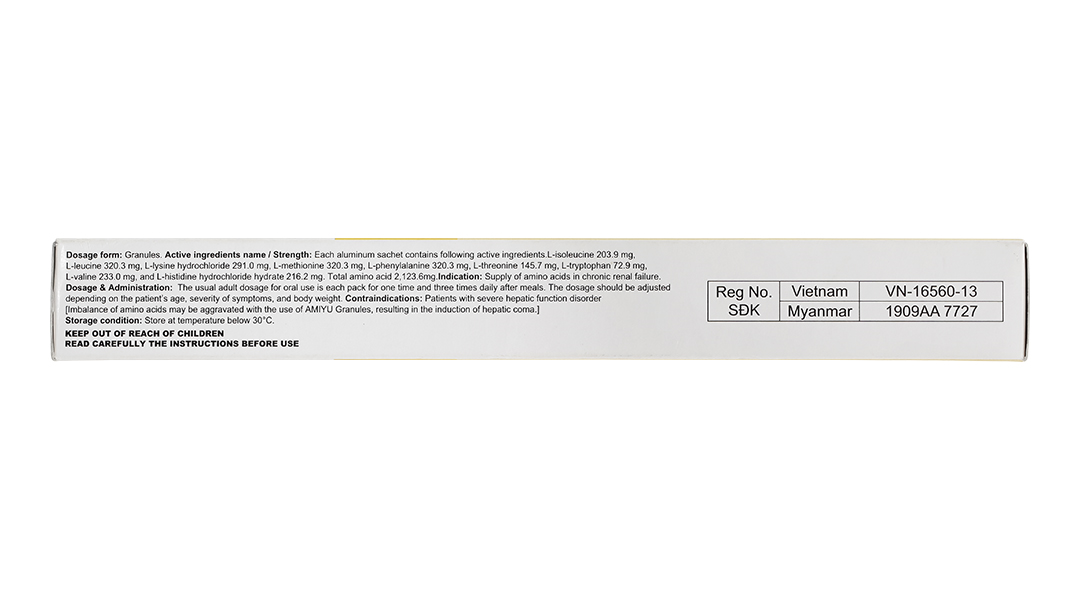 Việc điều trị bằng AMIYU Granules dựa trên cơ sở khi 8 loại acid amin thiết yếu và L-Histidin cần thiết ở bệnh nhân bị suy thận được sử dụng, các acid amin không thiết yếu được sinh tổng hợp từ nitơ urê với năng lượng đầy đủ, protein được tổng hợp sau đó và sự tích lũy các chất chuyển hóa nitơ của chất thải bị ức chế. Việc điều trị bằng AMIYU Granules đã được xác định là cải thiện các triệu chứng lâm sàng và làm chậm lại sự nặng thêm của bệnh.