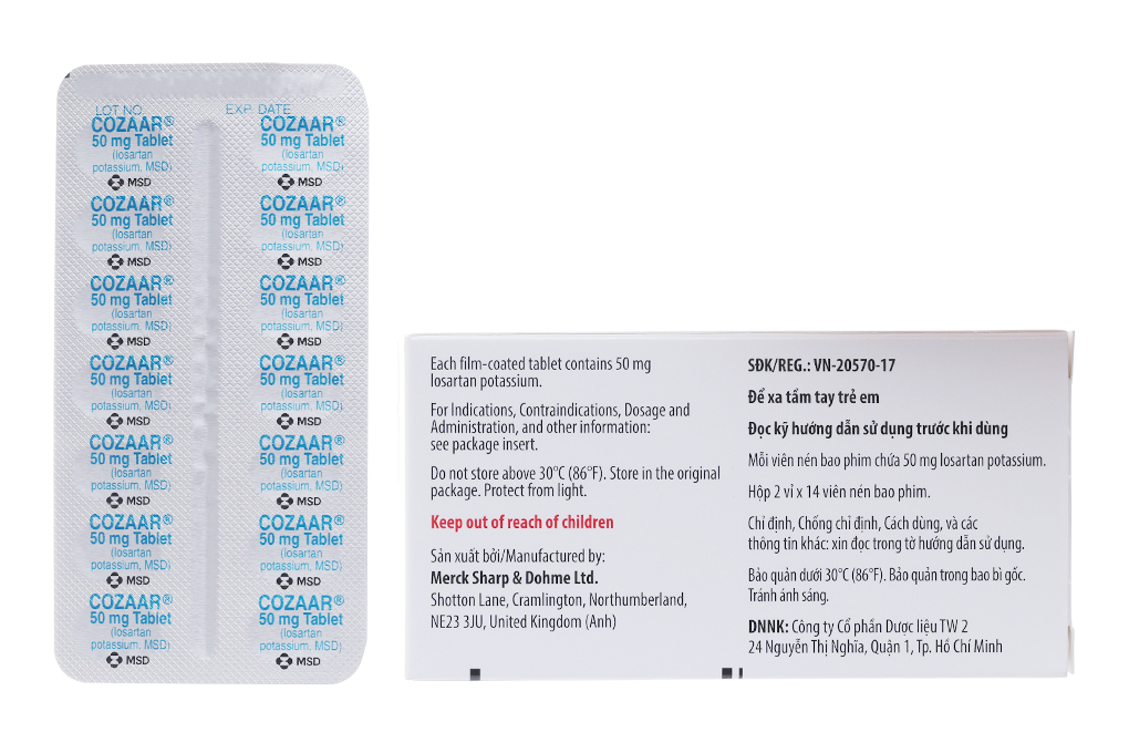 COZAAR (losartan kali), chất đầu tiên của một nhóm thuốc mới dùng cho điều trị tăng huyết áp, là chất đối kháng thụ thể angiotensin II týp AT1. COZAAR cũng làm giảm nguy cơ phối hợp về tử vong do bệnh lý tim mạch, đột quỵ và nhồi máu cơ tim trên các bệnh nhân tăng huyết áp có phì đại thất trái và bảo vệ thận cho người bệnh đái tháo đường týp 2 có protein niệu.