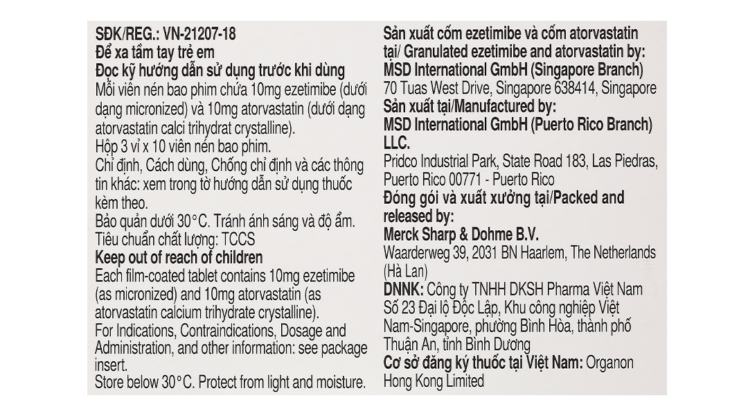 ATOZET 10 mg/10 mg: Hộp 3 vỉ x 10 viên nén bao phim.