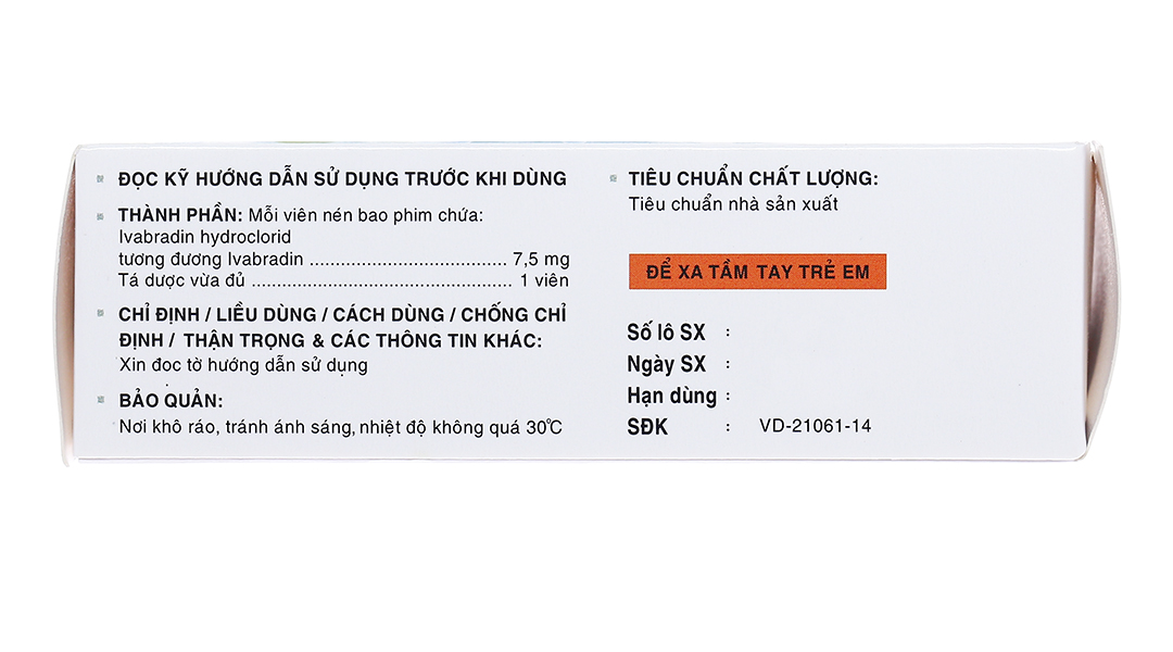 – Thận trọng khi sử dụngLoạn nhịp tim Ivabradin không hiệu quả trong điều trị hoặc phòng ngừa loạn nhịp tim và dường như mất tác dụng khi xảy ra loạn nhịp nhanh (như nhịp nhanh thất hoặc trên thất). Do đó không nên dùng ivabradin ở bệnh nhân rung tâm nhĩ hoặc các loạn nhịp tim khác có ảnh hưởng đến chức năng nút xoang. Bệnh nhân điều trị với ivabradin phải được theo dõi lâm sàng thường xuyên để phát hiện rung tâm nhĩ (liên tục hoặc kịch phát), nên theo dõi điện tâm đồ nếu có dấu hiệu trên lâm sàng. Nguy cơ rung tâm nhĩ cao hơn ở bệnh nhân suy tim mạn tính điều trị với Ivabradin. Rung tâm nhĩ thường gặp hơn ở bệnh ở bệnh nhân sử dụng đồng thời amiodaron hoặc thuốc chống loạn nhịp nhóm I. Theo dõi chặt chẽ bệnh nhân suy tim mạn tính với rối loạn dẫn truyền nội thất (phong bế bó nhánh trái, phong bế bó nhánh phải) và mất đồng bộ tâm thất. Bệnh nhân bloc nhĩ thất độ 2 Không khuyên dùng ivabradin ở bệnh nhân bloc nhĩ thất độ 2. Bệnh nhân nhịp tim chậm Không sử dụng ivabradin ở bệnh nhân có nhịp tim lúc nghỉ dưới 60 nhịp/ phút trước khi điều trị. Trong quá trình điều trị nên điều chỉnh giảm liều nếu nhịp tim lúc nghỉ thường xuyên dưới 50 nhịp/ phút hoặc bệnh nhân có triệu chứng liên quan đến chậm nhịp tim như chóng mặt, mệt mỏi, giảm huyết áp. Nên ngừng điều trị nếu nhịp tim vẫn duy trì dưới 50 nhịp/ phút hoặc nhịp tim chậm kéo dài. Phối hợp với các thuốc chẹn kênh calci Không nên phối hợp ivabradin với các thuốc chẹn kênh calci làm giảm nhịp tim như verapamil hoặc diltiazem. Không có dữ liệu về an toàn khi phối hợp ivabradin với các nitrat và các thuốc chẹn kênh calci dihydropyridin như amlodipin. Suy tim mạn tính Phải ổn định tình trạng suy tim trước khi điều trị với ivabaradin. Sử dụng thận trọng ở bệnh nhân suy tim độ IV theo NYHA do thiếu dữ liệu ở nhóm bệnh nhân này. Sốc Không sử dụng ivabradin ngay sau khi xảy ra sốc. Ảnh hưởng thị giác Ivabradin ảnh hưởng đến chức năng của võng mạc. Cho đến nay vẫn chưa có bằng chứng tác dụng có hại của thuốc trên võng mạc. Nên ngừng thuốc nếu bất kỳ tổn thương thị giác nào xảy ra. Nên thận trọng ở bệnh nhân viêm võng mạc sắc tố. Bệnh nhân giảm huyết áp Chưa có đầy đủ dữ liệu ở bệnh nhân giảm huyết áp nhẹ tới trung bình, do đó nên thận trọng ở những bệnh nhân này. Chống chỉ định ivabradin ở bệnh nhân giảm huyết áp nặng (< 90/50 mmHg). Bệnh nhân bị hội chứng QT bẩm sinh hoặc đang điều trị với thuốc có khả năng kéo dài QT Không nên sử dụng ivabradin ở bệnh nhân bị hội chứng QT bẩm sinh hoặc đang điều trị với thuốc có khả năng kéo dài QT. Nếu cần thiết phải phối hợp, phải theo dõi tim chặt chẽ. Để xa tầm tay trẻ em. – Thai kỳ và cho con búKhông sử dụng ivabradin cho phụ nữ có thai và cho con bú. – Khả năng lái xe và vận hành máy mócThuốc không ảnh hưởng đến khả năng lái xe và vận hành máy móc. Tuy nhiên, ivabradin có thể gây đom đóm mắt thoáng qua khi có sự thay đổi đột ngột về cường độ ánh sáng, đặc biệt khi lái xe ban đêm. Vì vậy nên thận trọng – Tương tác thuốcChống chỉ định phối hợp ivabradin với những thuốc có khả năng ức chế CYP3A4 như thuốc kháng nấm azol (ketoconazol, itraconazol), kháng sinh nhóm macrolid (clarithromycin, erythromycin uống, josamycin, telithromycin), thuốc ức chế HIV protease (nelfinavir, ritonavir) và nefazodon. Ketoconazol (200 mg một lần/ ngày) và josamycin (1 g x 2 lần/ ngày) làm tăng nồng độ huyết tương trung bình của ivabradin lên 7 – 8 lần. Không nên phối hợp ivabradin với những thuốc có khả năng kéo dài QT như các thuốc tim mạch (quinidin, disopyramid, bepridil, sotalol, ibutilid, amiodaron), không phải thuốc tim mạch (pimozid, ziprasidon, sertindol, mefloquin, halofantrin, pentamidin, cisaprid, erythromycin tiêm tĩnh mạch). Thận trọng khi phối hợp: – Thuốc ức chế CYP3A4 trung bình: Khi sử dụng đồng thời ivabradin với các thuốc ức chế CYP3A4 trung bình (như fluconazol), nên bắt đầu ở liều 2,5 mg x 2 lần/ ngày nếu nhịp tim lúc nghỉ trên 60 nhịp/ phút và phải theo dõi chặt chẽ. – Nước ép bưởi: nồng độ ivabradin tăng khoảng 2 lần khi dùng chung với nước ép bưởi. Do đó không nên dùng nước ép bưởi khi điều trị với thuốc. – Thuốc cảm ứng CYP3A4: Thuốc cảm ứng CYP3A4 (như rifampicin, barbiturat, phenytoin, St John’s wort) có thể làm giảm nồng độ và tác dụng ivabradin. Có thể phải điều chỉnh liều dùng ivabradin. St John’s wort làm giảm một nửa nồng độ ivabradin, nên tránh phối hợp. |