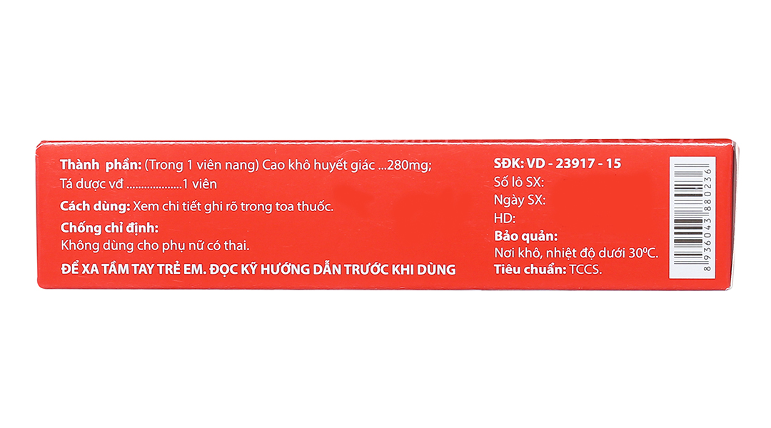 Hoạt chất: Cao khô Huyết giác (Lignum Dracaenae cambodianae) 280mg (tương đương với 4g dược liệu).