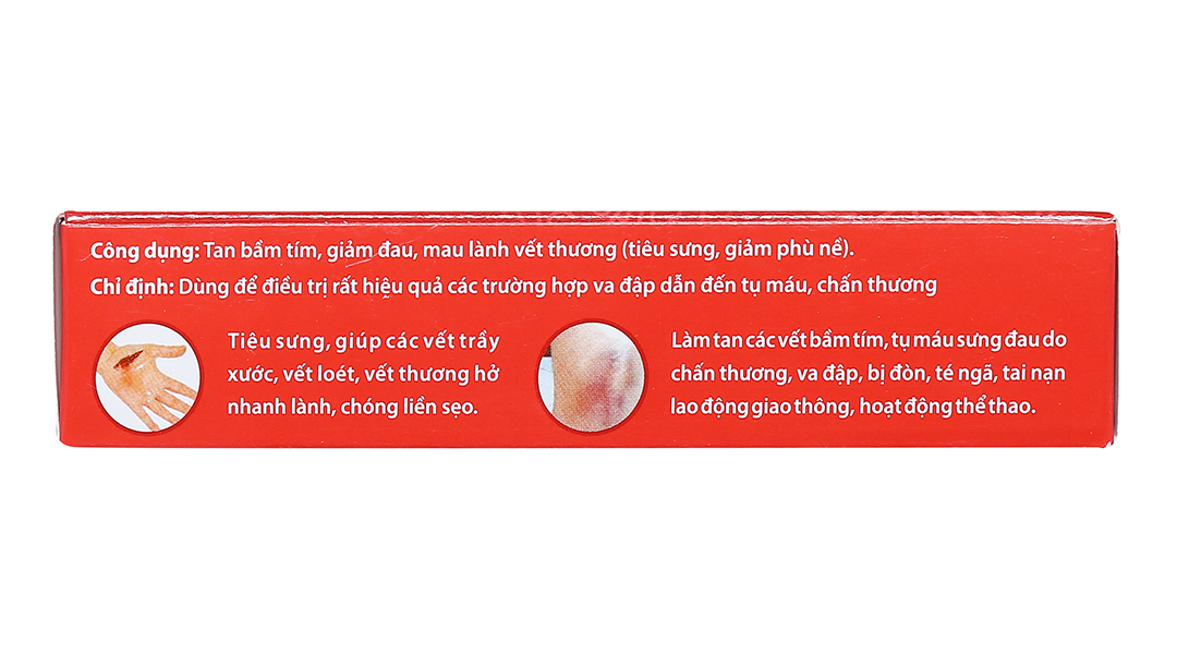 – Sưng đau, bầm tím, bong gân, chấn thương do va đập, bị đòn, té ngã, tai nạn lao động, giao thông, luyện tập thể thao. Giúp giảm đau và làm tan nhanh các vết bầm tím.