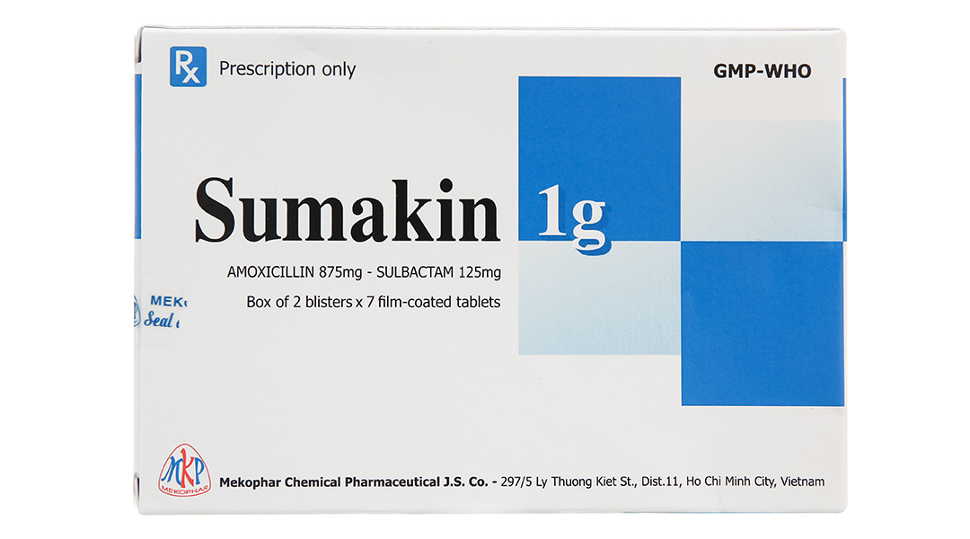 - SUMAKIN 1g là thuốc có tác dụng diệt khuẩn đối với các vi khuẩn nhạy cảm với amoxicillin, sự phối hợp amoxicillin với sulbactam theo tỉ lệ 7:1 giúp cho amoxicillin không bị beta-lactamase phá hủy.