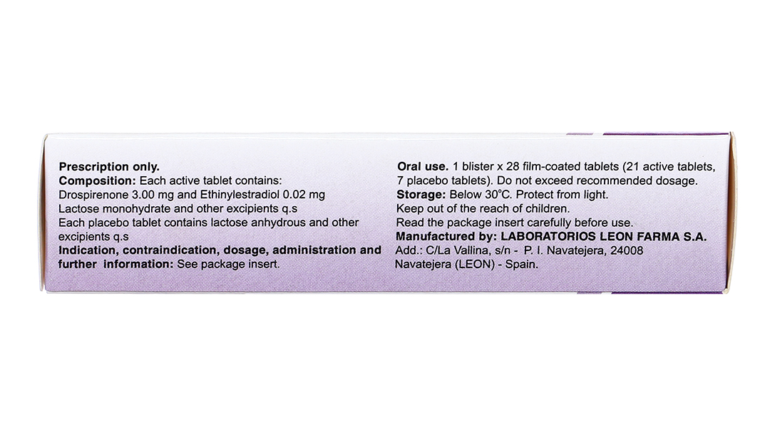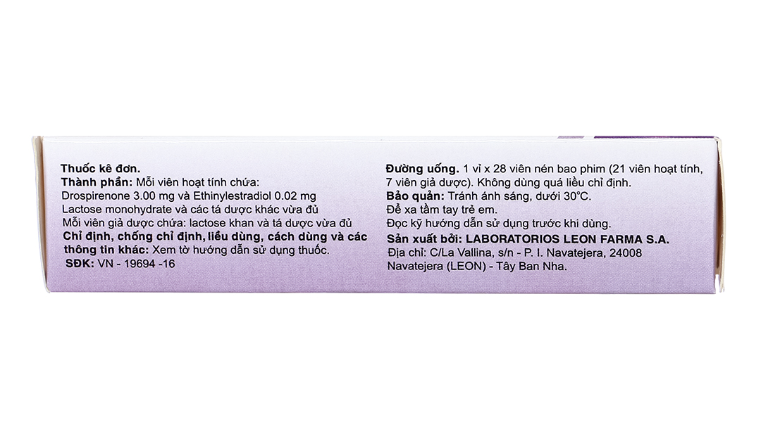 Hoạt chất: Drospirenone 3mg, Ethinylestradiol 0.02 mg.