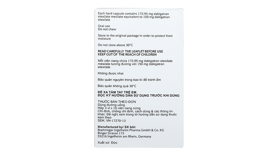 Pradaxa 150mg phòng ngừa tai biến, đột quỵ (3 vỉ x 10 viên)