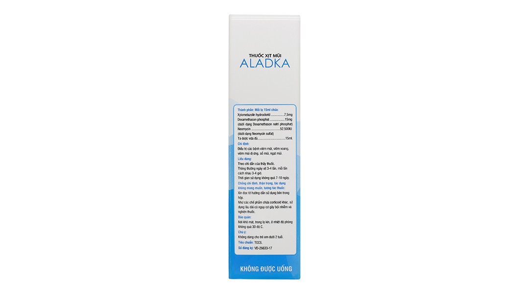 “Phản ứng phụ nghiêm trọng ít khi xảy ra khi dùng tại chỗ thuốc xịt mũi Aladka 3 thành phần Dexamethason, Xylometazolin, Neomycin ở liều điều trị. Một số phản ứng phụ thường gặp nhưng thoáng qua có thể gây kích ứng tạm thời tại chỗ, nóng rát ở mũi, buồn nôn, nhức đầu, khô niêm mạc mũi hoặc có thể gây các phản ứng mẫn cảm với một trong các thành phần của thuốc. Một số phản ứng toàn thân xảy ra do thuốc nhỏ mũi thấm xuống họng gây: