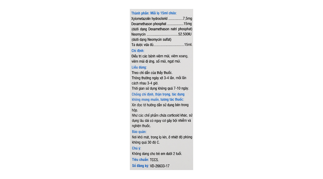 (Tá dược gồm: Natri edetat, Natri metabisulfit, Natri dihydrophosphate, Menthol, Borneol, Ethanol, Acid-hydrochloride, Natri hydroxyd).