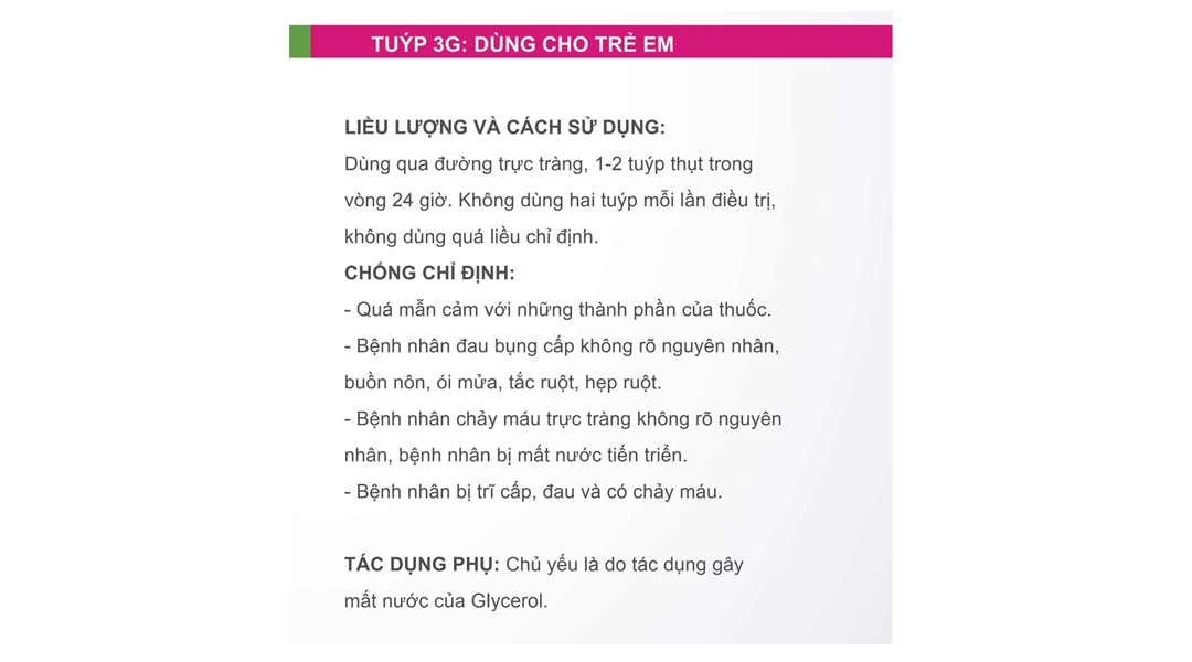 – Dùng qua đường trực tràng: 1 – 2 tuýp thụt 3g trong vòng 24h.