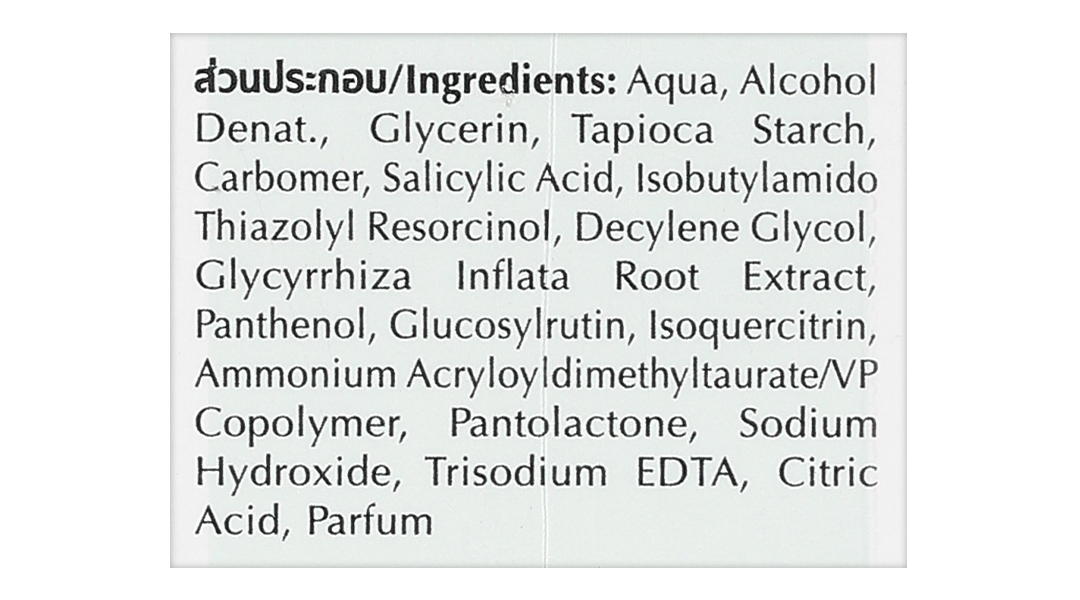 Aqua, Alcohol Denat., Glycerin, Tapioca Starch, Carbomer, Salicylic Acid, Isobutylamido Thiazolyl Resorcinol, Decylene Glycol, Glycyrrhiza Inflata Root Extract, Panthenol, Glucosylrutin, Isoquercitrin, Ammonium Acryloyldimethyltaurate/VP Copolymer, Pantolactone, Sodium Hydroxide, Trisodium EDTA, Citric Acid, Parfum.