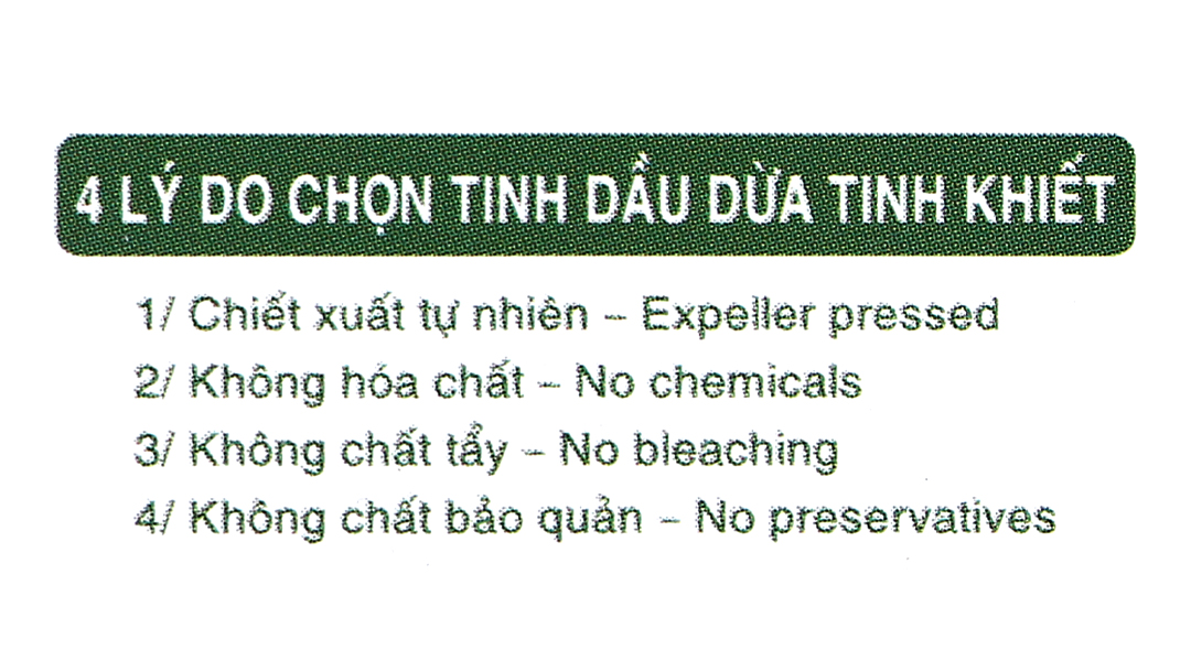 Cocos Nucifera Oil, làm hoàn toàn từ dừa Bến Tre, được chiết ép từ cơm dừa tươi nguyên chất.
