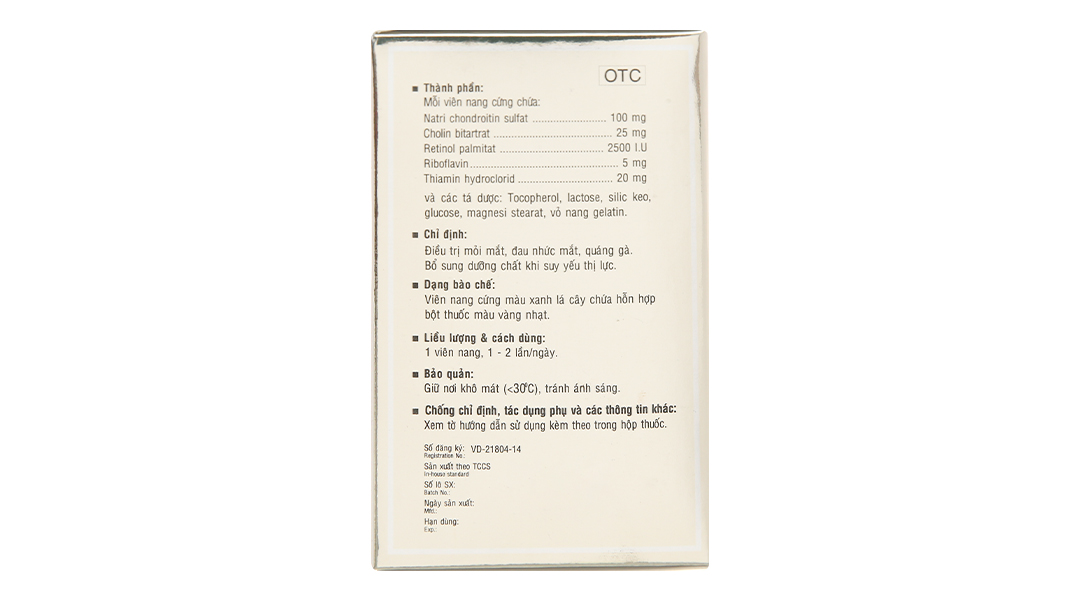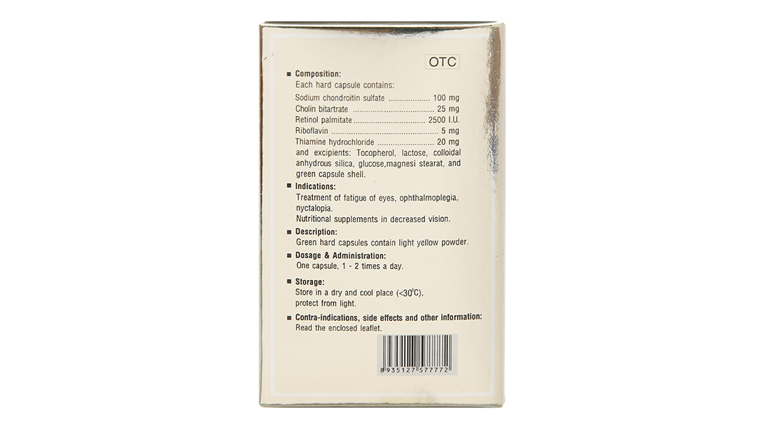 Hoạt chấtCholin bitartrat, Thiamin hydroclorid, Retinol palmitat, Riboflavin, Natri chondroitin Sulfat