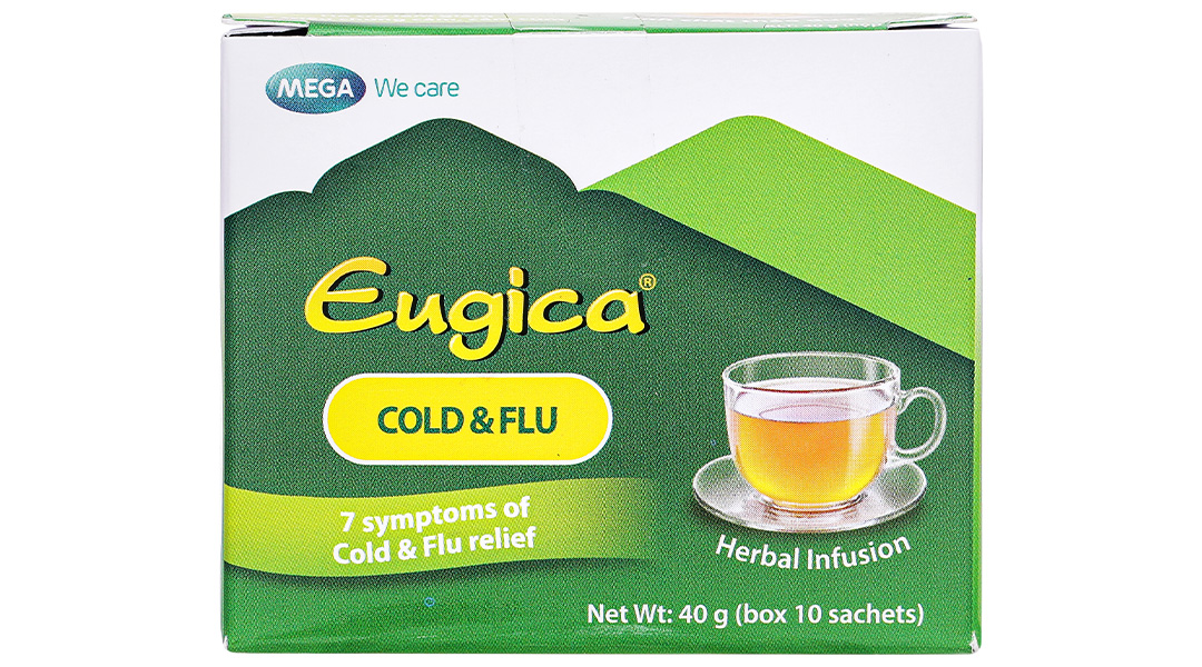 - Tinh chất thảo dược Eugica Cold & Flu là một sản phẩm chăm sóc sức khỏe đường hô hấp được sản xuất bởi thương hiệu nổi tiếng Mega We Care. Với sự kết hợp tuyệt vời của 14 loại thảo dược tự nhiên, sản phẩm mang lại hiệu quả trong việc hỗ trợ làm giảm các triệu chứng cảm cúm thông thường như đau đầu, sổ mũi, nghẹt mũi, hắt hơi, ho, đau họng, và ngứa họng.