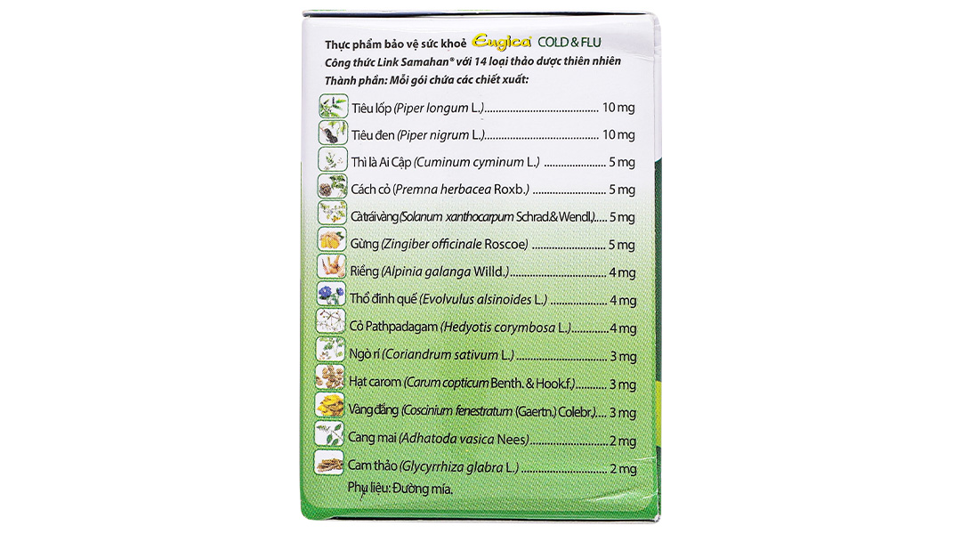 - Cảm cúm là bệnh lý đường hô hấp do virus cúm gây ra, thường gặp nhất trong mùa đông hoặc thời tiết giao mùa, khi cơ thể dễ bị lây nhiễm. Với các thành phần thiên nhiên như Tiêu lốp, Tiêu đen, Gừng, Cà trái vàng, Riềng, Thổ đinh quế, và nhiều thảo dược quý khác, Eugica Cold & Flu không chỉ giúp làm dịu các triệu chứng khó chịu mà còn hỗ trợ tăng cường sức đề kháng của cơ thể, giúp phục hồi nhanh chóng và ngăn ngừa bệnh tái phát. Sự kết hợp giữa các thảo dược này với công nghệ sản xuất hiện đại giúp bảo đảm chất lượng và hiệu quả tối ưu trong việc hỗ trợ điều trị cảm cúm.