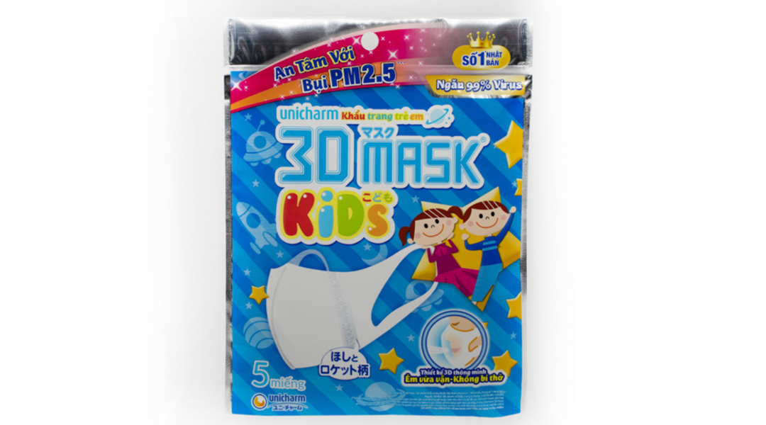 – Túi 5 cái khẩu trang các loại Unicharm 3D Mask Kids quai đeo co giãn và mềm mại không gây cảm giác đau hay khó chịu tai của bé.
