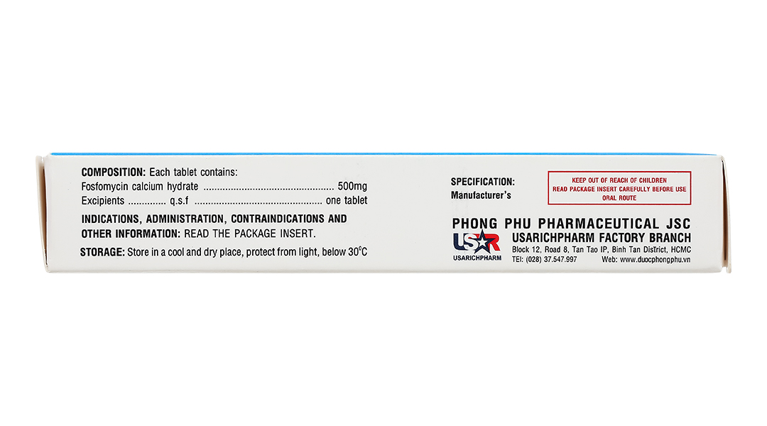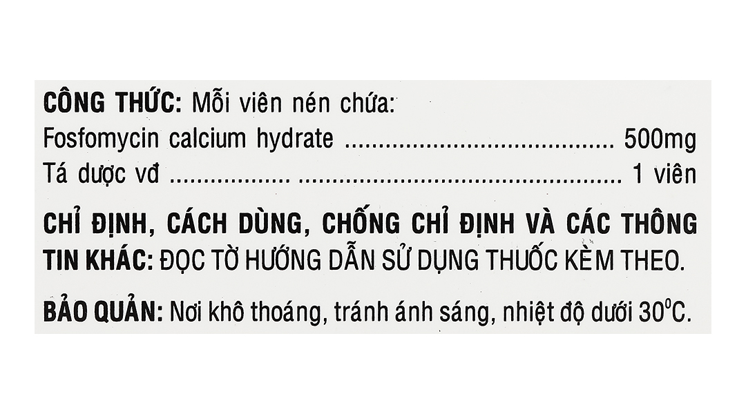– Thận trọng khi sử dụngTrong điều trị nếu không phối hợp kháng sinh có thể gặp vi khuẩn kháng thuốc nhanh đột biến. Để hạn chế sự kháng fosfomycin của vi khuẩn cần phải phối hợp thuốc với các kháng sinh khác. Cần thận trọng khi dùng thuốc ở những người bệnh có phù, tăng huyết áp hoặc đang dùng corticoid. Những người bệnh suy tim đang dùng thuốc trợ tim loại digitalis nếu dùng fosfomycin kéo dài cần phải thường xuyên kiểm tra kali huyết và dùng bổ sung kali vì thuốc có thể làm hạ kali huyết. Sử dụng cho bệnh nhân cao tuổi: Fosfomycin được bài tiết chủ yếu qua thận. Do bệnh nhân cao tuổi thường bị giảm chức năng thận, cần lưu ý khi sử dụng thuốc cho đối tượng bệnh nhân này, có thể cần giảm liều. Manitol: Có thể có tác dụng nhuận tràng nhẹ. – Thai kỳ và cho con búSử dụng thuốc cho phụ nữ có thai: Không có dữ liệu về sử dụng thuốc trên phụ nữ có thai, chỉ nên dùng thuốc nếu lợi ích vượt trội so với nguy cơ. Sử dụng thuốc cho phụ nữ cho con bú: Thuốc vào được sữa mẹ. Mặc dù nồng độ fosfomycin rất thấp trong sữa mẹ nhưng vẫn không nên dùng thuốc khi mẹ đang cho con bú. Trường hợp phải dùng fosfomycin thì mẹ phải ngừng cho con bú. – Khả năng lái xe và vận hành máy mócThận trọng khi lái xe và vận hành máy móc vì thuốc có thể gây đau đầu, ù tai, chóng mặt, khó chịu,… – Tương tác thuốcMetoclopramide và các thuốc làm tăng nhu động đường tiêu hóa khi dùng đồng thời với fosfomycin sẽ làm giảm nồng độ fosfomycin trong huyết tương và trong nước tiểu. Fosfomycin có tác dụng hiệp đồng tăng mức với kháng sinh nhóm Betalactam, aminoglycoside, macrolide, tetracycline, chloramphenicol, rifamycin, colistin, vancomycin và lincomycin. |