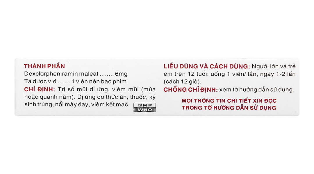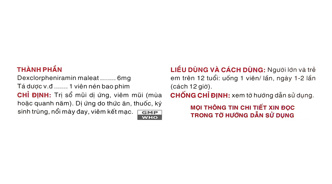 Công dụngTrị sổ mũi dị ứng, viêm mũi, dị ứng do thức ăn, thuốc, ký sinh trùng, nổi mề đay,...