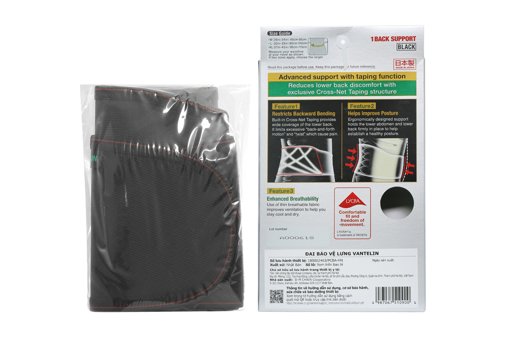Đây là dạng băng vải bằng sợi Lycra do Nhật Bản sản xuất và xuất khẩu đi nhiều nước trên thế giới. Đai lưng Vantelin có điểm hay là mỏng nhẹ, đeo không bị cấn lưng, cố định cột sống lưng rất tốt.