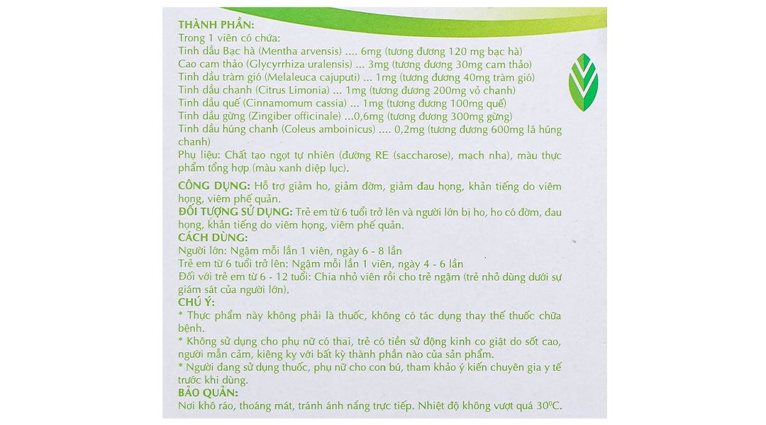 Tinh dầu Bạc hà (Mentha arvensis) | 6mg (tương đương 120 mg bạc hà) |