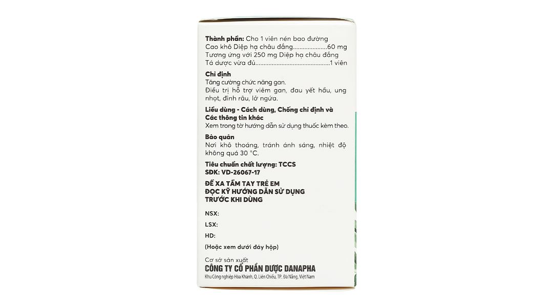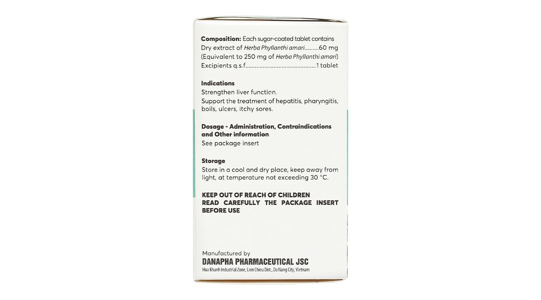 – Cao khô diệp hạ châu đắng 60mg (Tương ứng với 250mg diệp hạ châu đắng (Herba Phyllanthi amari)).