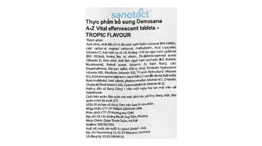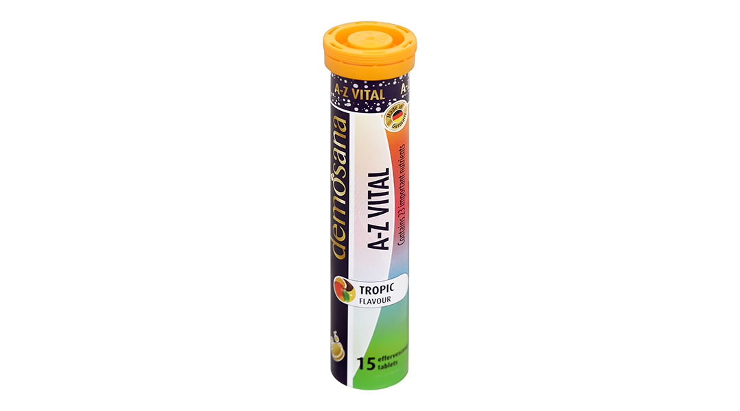 - Viên sủi Demosana A-Z Vital là một giải pháp hoàn hảo giúp bổ sung đầy đủ các vitamin và khoáng chất thiết yếu cho cơ thể. Với hơn 20 loại vitamin và khoáng chất có trong mỗi viên, sản phẩm này giúp lấp đầy khoảng trống dinh dưỡng do chế độ ăn uống thiếu hụt, đồng thời hỗ trợ sức khỏe tổng thể, tăng cường sức đề kháng, giảm mệt mỏi và căng thẳng, mang đến một tinh thần minh mẫn và tràn đầy năng lượng. Bằng cách cung cấp các vitamin thiết yếu như vitamin C, D, E, các vitamin nhóm B, cũng như các khoáng chất quan trọng như kẽm, magie và sắt, A-Z Vital giúp cơ thể hoạt động hiệu quả hơn trong suốt ngày dài. Đây là sự lựa chọn lý tưởng cho cả trẻ em và người trưởng thành, nhất là những người có lối sống bận rộn, cần bổ sung dinh dưỡng đầy đủ và kịp thời.