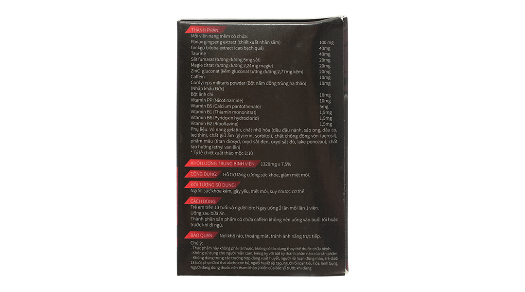 Hoạt chấtVitamin B2 (Riboflavine), Cafein, Ginkgo biloba extract (cao bạch quả), Panax ginseng extract (chiết xuất nhân sâm), Cordyceps militaris powder (Bột nấm đông trùng hạ thảo), ZinC gluconat, Bột linh chi, Magie citrat, Vitamin B1 (Thiamin mononitrat), Vitamin PP (Nicotinamide), Vitamin B6 (Pyridoxin hydroclorid), Taurin, Vitamin B5 (Calcium pantothenate), Sắt fumarat
