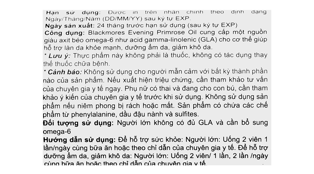 Blackmores Evening Primrose Oil cung cấp một nguồn giàu axit béo omega-6 như acid gamma-linolenic (GLA) cho cơ thể giúp hỗ trợ làn da khỏe mạnh, dưỡng ẩm da, giảm khô da.