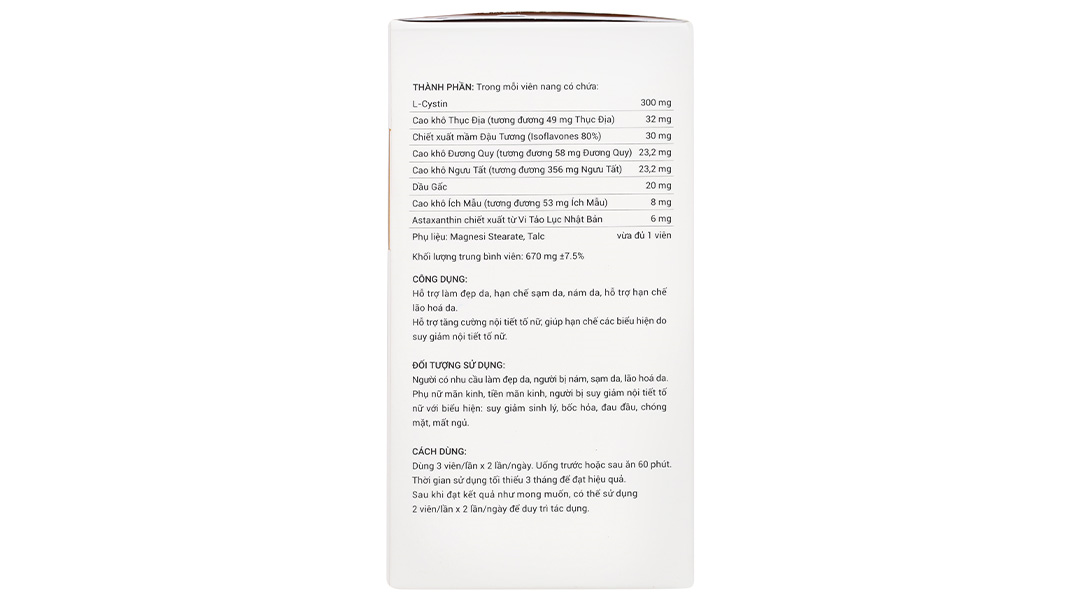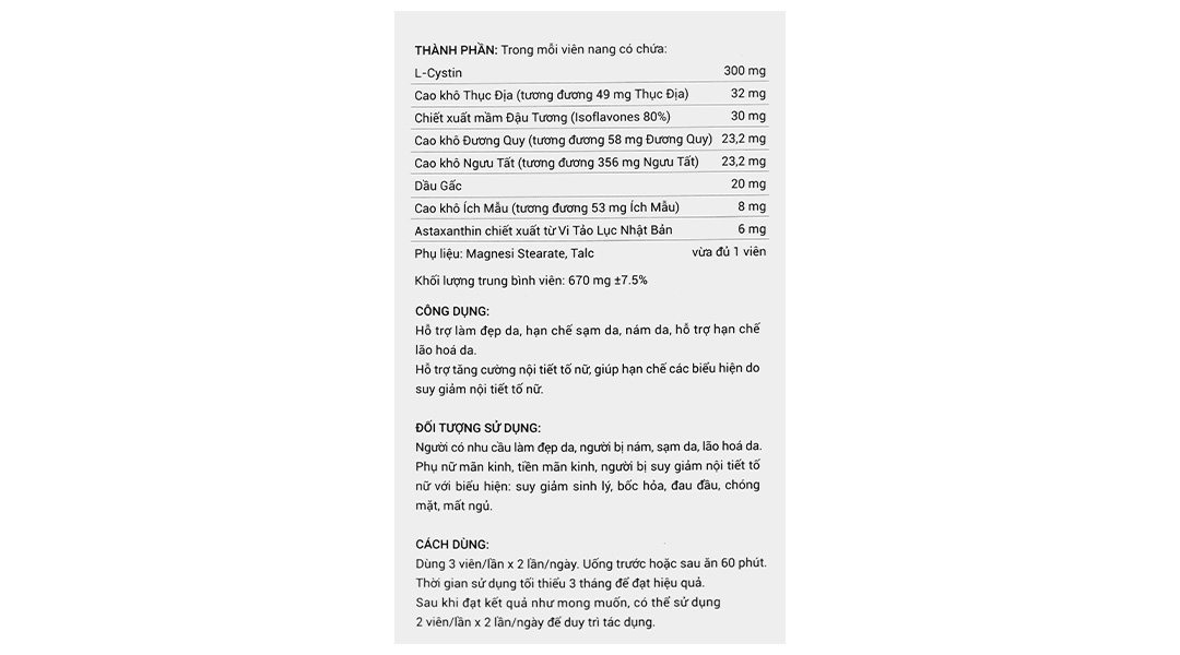 Công dụngHỗ trợ làm đẹp da, hạn chế sạm da, nám da, hỗ trợ hạn chế lão hóa da
