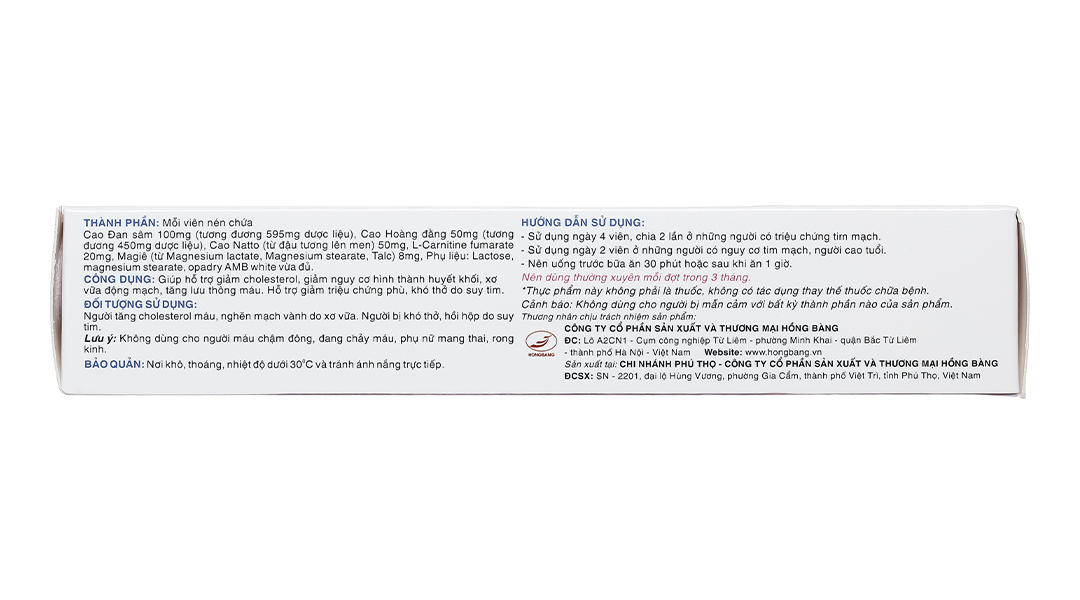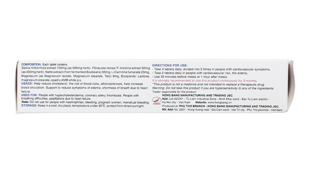 Cao Đan sâm 100mg (tương đương 595mg dược liệu), Cao Hoàng đằng 50mg (tương đương 450mg dược liệu), Cao Natto (từ đậu tương lên men) 50mg, L-Carnitine fumarate 20mg, Magiê (từ Magnesium lactate, Magnesium stearate, Talc) 8mg.