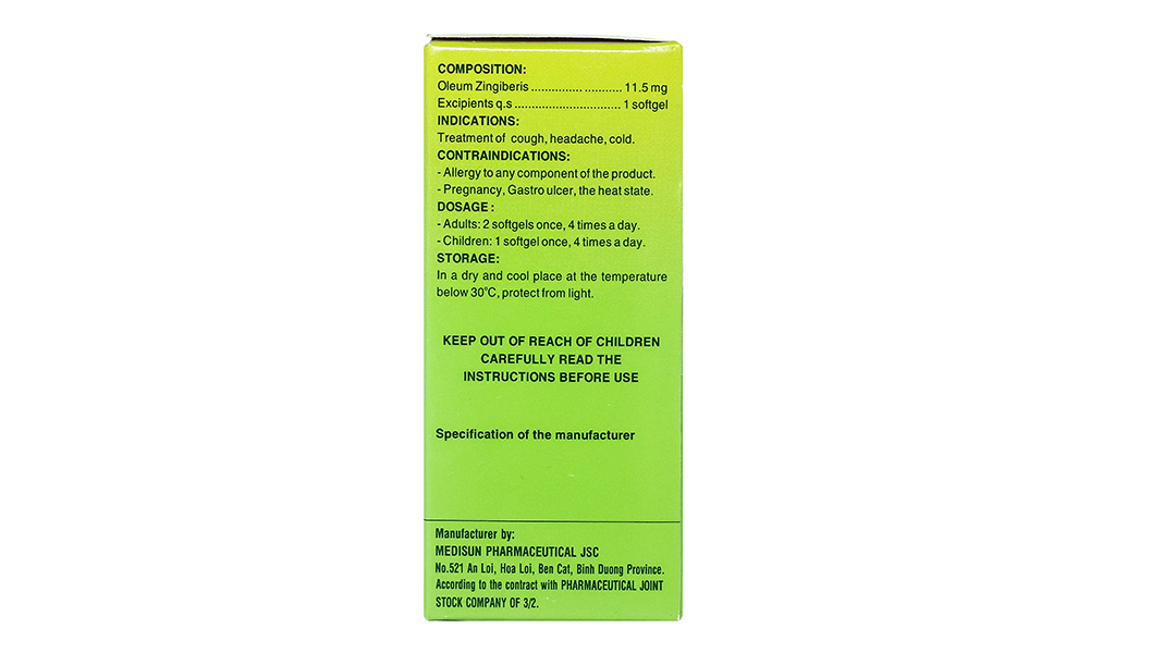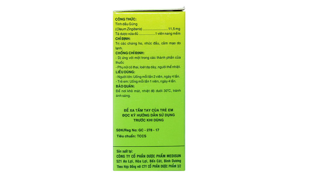 Hoạt chất: Tinh dầu Gừng (Oleum Zingiberis) 11,5mg.