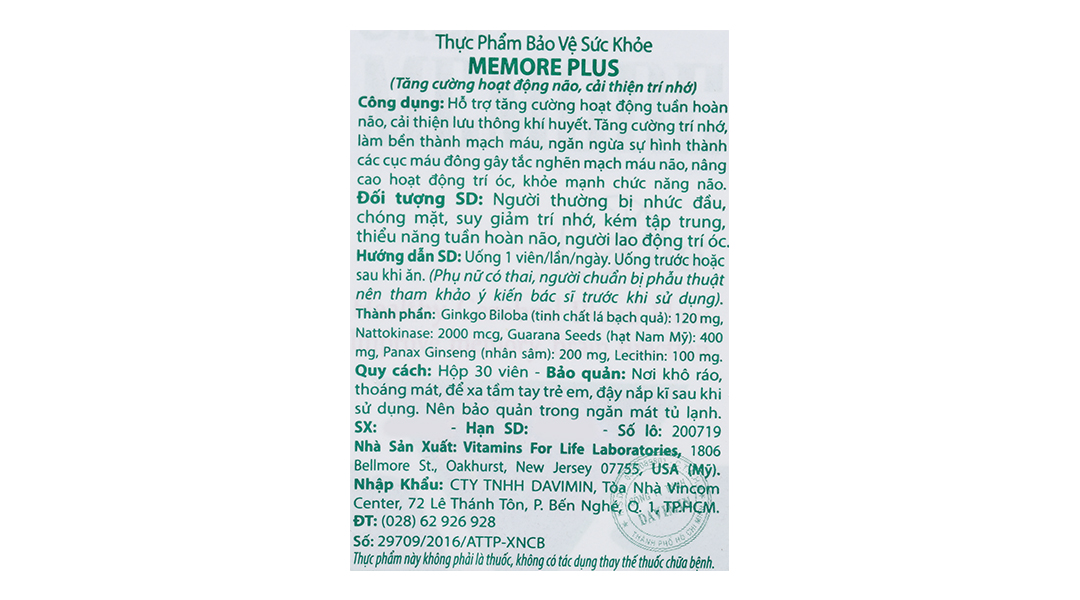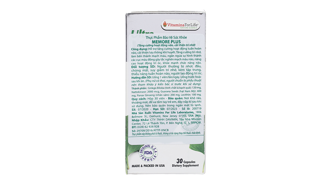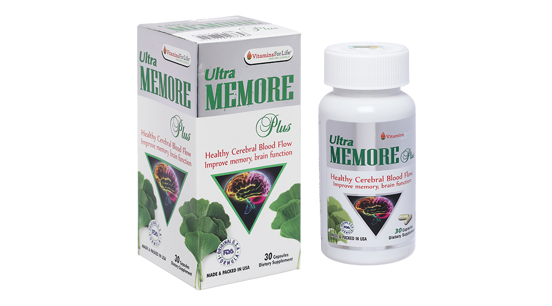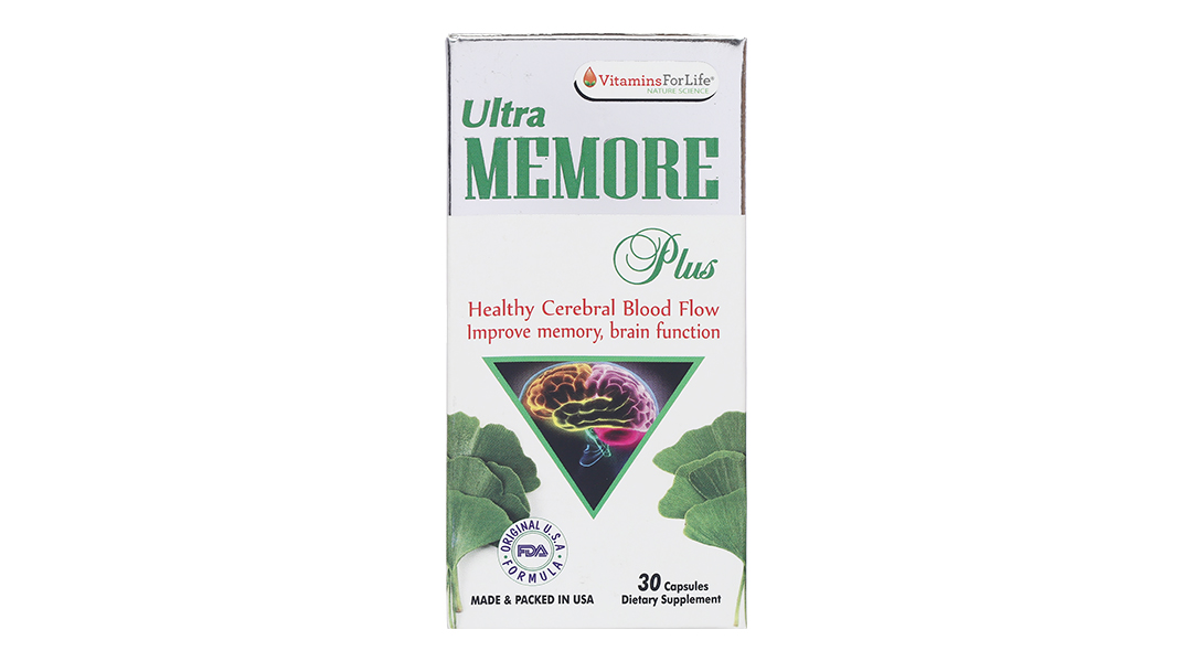 Viên uống bổ não Ultra Memore Plus được bào chế và sản xuất bởi Vitamins For Life, USA (Mỹ), với thành phần chiết xuất từ thảo dược dược tính cao, tuân thủ tiêu chuẩn an toàn của FDA (Mỹ), tinh chất 100% từ thiên nhiên, giúp hấp thu nhanh, không tác dụng phụ, không chất bảo quản.