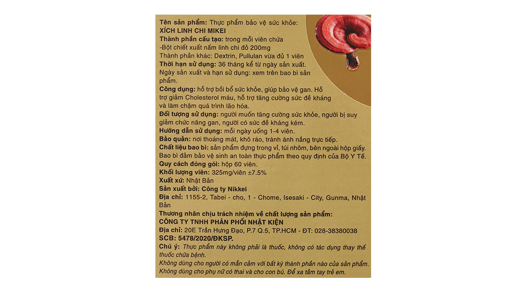 Xích linh chi Mikei hộp 60 viên là sản phẩm thực phẩm chức năng có xuất xứ từ Nhật Bản, chứa thảo dược thiên nhiên – tinh khiết và không chứa thuốc bảo vệ thực vật. Kiểm nghiệm đạt tiêu chuẩn quốc tế của Tổ chức Y tế Thế giới (WHO) và được tiêu thụ rộng rãi tại nhiều quốc gia trên thế giới.