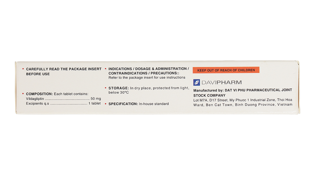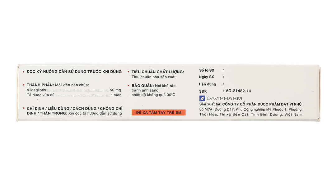 – Thận trọng khi sử dụngCảnh báo chung Vildagliptin không dùng để thay thế cho insulin những bệnh nhân cần dùng insulin. Không dùng vildagliptin cho bệnh nhân đái tháo đường tuýp 1 hoặc bệnh nhân bị nhiễm toan ceton trong đái tháo đường. Bệnh nhân suy thận Kinh nghiệm sử dụng vildagliptin ở bệnh nhân bị ESRD phải thẩm tách máu còn hạn chế. Vì vậy nên thận trọng khi dùng vildagliptin ở những bệnh nhân này. Bệnh nhân suy gan Không nên dùng vildagliptin ở bệnh nhân suy gan, bao gồm bệnh nhân có ALT hoặc AST > 3 lần ULN trước khi điều trị. Theo dõi enzym gan Đã có báo cáo trường hợp hiếm gặp rối loạn chức năng gan (bao gồm viêm gan). Trong những trường hợp này, các triệu chứng thường không để lại di chứng trên lâm sàng và kết quả xét nghiệm chức năng gan trở về bình thường sau khi ngừng thuốc. Xét nghiệm chức năng gan nên được thực hiện trước khi khởi đầu điều trị với vildagliptin để biết được giá trị ban đầu của bệnh nhân. Chức năng gan nên được theo dõi trong khi điều trị với vildagliptin theo chu kỳ 3 tháng 1 lần trong năm đầu tiên và định kỳ sau đó. Bệnh nhân có dấu hiệu tăng nồng độ transaminase nên được theo dõi bằng cách đánh giá chức năng gan lần thứ 2 để xác nhận lại và sau đó theo dõi chức năng gan thường xuyên đến khi những bất thường trở lại bình thường. Nếu AST hoặc ALT tăng ≥ 3 lần ULN hoặc tăng dai dẳng, nên ngừng vildagliptin. Bệnh nhân bị vàng da hoặc các dấu hiệu khác gợi ý rối loạn chức năng gan nên ngừng vildagliptin. Sau khi ngừng điều trị với vildagliptin và xét nghiệm chức năng gan trở lại bình thường, không nên tái sử dụng vildagliptin. Bệnh nhân suy tim Một thử nghiệm lâm sàng dùng vildagliptin ở bệnh nhân bị suy tim NYHA độ I – III cho thấy điều trị với vildagliptin không gây thay đổi chức năng thất trái hoặc nặng hơn tình trạng suy tim sung huyết hiện có so với nhóm chứng. Kinh nghiệm lâm sàng sử dụng Bệnh trên da Tổn thương da, bao gồm bong da và loét đã được báo cáo ở chi của khỉ trong một nghiên cứu độc tính không thuộc lâm sàng. Mặc dù chưa thấy tăng tỉ lệ tổn thương da trong các thử nghiệm lâm sàng, kinh nghiệm dùng thuốc trên bệnh nhân đái tháo đường có biến chứng da còn hạn chế. Hơn nữa đã có những báo cáo tổn thương da bóng nước và tróc da sau khi đưa thuốc ra thị trường. Vì vậy, ngoài những chăm sóc bình thường cho bệnh nhân đái tháo đường, nên theo dõi những bệnh trên da như bong da hoặc loét. Viêm tụy cấp Vildagliptin có thể làm tăng nguy cơ viêm tụy cấp ở bệnh nhân. Nên thông báo cho bệnh nhân về đặc tính này. Nếu nghi ngờ bệnh nhân bị viêm tụy, nên ngừng vildagliptin; Nếu xác định có viêm tụy, không nên tái sử dụng vildagliptin. Nên thận trọng ở bệnh nhân có tiền sử viêm tụy cấp. Hạ glucose huyết Sulphonylure có thể gây hạ glucose huyết. Bệnh nhân dùng vildagliptin phối hợp với sulphonylure có thể có nguy cơ bị hạ glucose huyết. Vì vậy, có thể cân nhắc dùng sulphonylure liều thấp hơn để giảm nguy cơ hạ glucose huyết. Thuốc có chứa lactose, bệnh nhân mắc bệnh di truyền hiếm gặp không dung nạp galactose, thiếu hụt Lapp lactase hoặc rối loạn hấp thu glucose-galactose không nên dùng thuốc này. Để xa tầm tay trẻ em. Không dùng quá liều chỉ định. – Thai kỳ và cho con búPhụ nữ có thai Chưa có thông tin đầy đủ về việc sử dụng vildagliptin ở phụ nữ mang thai. Nghiên cứu trên động vật cho thấy độc tính trên khả năng sinh sản ở liều cao. Nguy cơ có thể có ở người còn chưa rõ. Do thiếu thông tin trên người, không nên dùng vildagliptin trong thai kì. Phụ nữ cho con bú Chưa rõ vildagliptin có tiết qua sữa mẹ không. Nghiên cứu trên động vật cho thấy vildagliptin tiết qua sữa. Không nên dùng vildagliptin khi đang cho con bú. Khả năng sinh sản Chưa có nghiên cứu ảnh hưởng của vildagliptin trên khả năng sinh sản ở người. – Khả năng lái xe và vận hành máy mócChưa có nghiên cứu ảnh hưởng của vildagliptin lên khả năng lái xe và vận hành máy móc. Bệnh nhân bị tác dụng không mong muốn chóng mặt nên tránh lái xe hoặc vận hành máy móc. – Tương tác thuốcVildagliptin ít tương tác với các thuốc dùng chung. Vì vildagliptin không phải là cơ chất và không ức chế hoặc cảm ứng các enzym CYP 450, vildagliptin thường không tương tác với các chất là cơ chất, chất ức chế hoặc cảm ứng các enzym này. Dùng phối hợp với pioglitazon, metformin và glyburid Kết quả nghiên cứu thực hiện với các thuốc trị đái tháo đường đường uống cho thấy không có tương tác có ý nghĩa lâm sàng. Digoxin (cơ chất của Pgp), warfarin (cơ chất của CYP2C9) Nghiên cứu lâm sàng thực hiện trên đối tượng khỏe mạnh cho thấy không có tương tác có ý nghĩa lâm sàng. Tuy nhiên nghiên cứu chưa được thực hiện trên đối tượng bệnh nhân. Dùng phối hợp với amlodlpin, ramipril, valsartan hoặc simvastatin Nghiên cứu tương tác thuốc – thuốc ở đối tượng khỏe mạnh được thực hiện