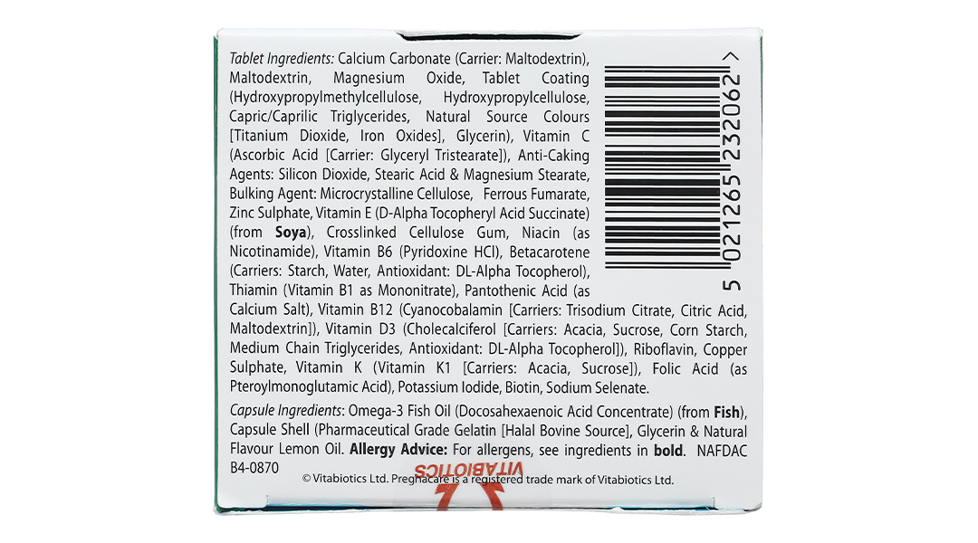 Hoạt chấtSắt (Sắt Fumarat), Đồng (Đồng sulfat), Kẽm (Kẽm sulfat), Magnesi (Magnesi oxyd) , DHA (Docosahexaenoic acid), Vitamin K, Vitamin B6 (Pyridoxine hydroclorid), Vitamin C (Acid L-ascorbic), Niacin (Nicotinamide), Vitamin B12 (Cyanocobalamin), Vitamin B2 (Riboflavin), Vitamin D3 (Cholecalciferol), Selen (Natri selen), Calci (Calci carbonat), Vitamin B1 (Thiamin mononitrat), Folic acid (Pteroylmonoglutamic acid), Biotin, Vitamin E (D-alpha tocopheryl acid succinat), EPA (Eicosapentaenoic acid), Iốt (Kali iốt), Betacaroten, Pantothenic acid (muối canxi)