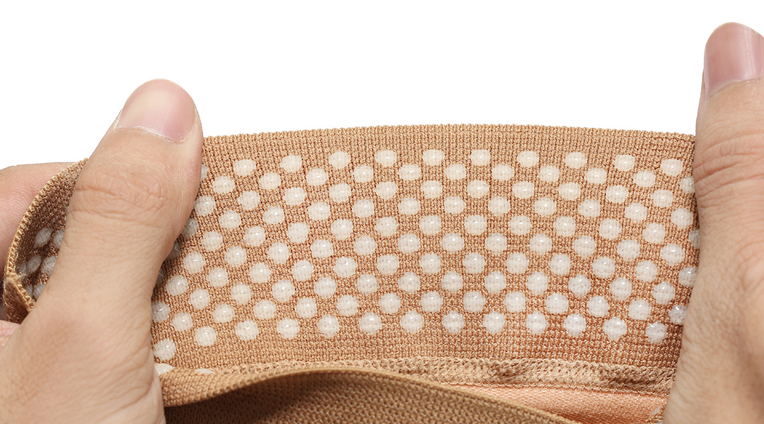 - Đặt cả hai ngón tay cái vào giữa vải dệt kim và chân của bạn. Và nhẹ nhàng kéo tất qua gót chân của bạn.
