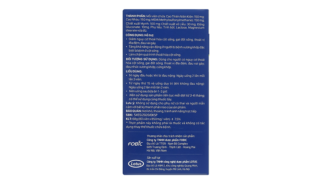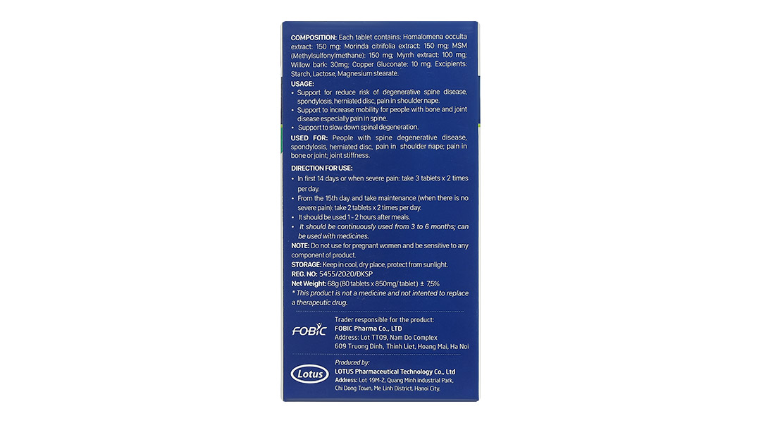 Đối tượng sử dụngNgười có nguy cơ thoái hóa cột sống, gai đốt sống, thoát vị đĩa đệm, đau vai gáy,...
