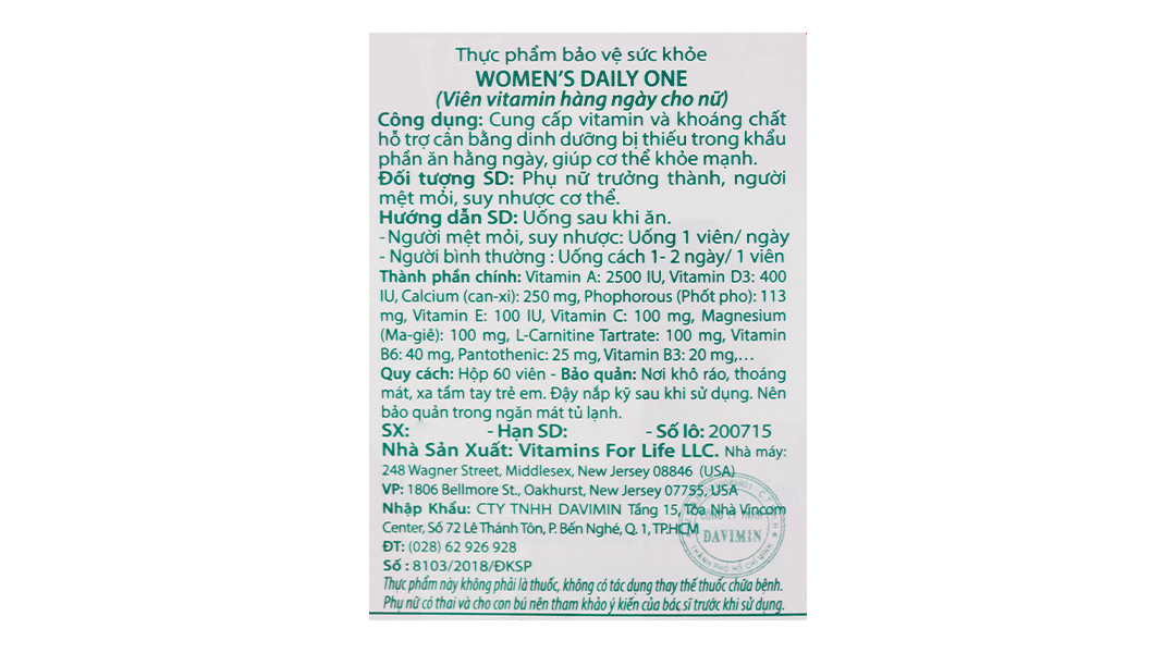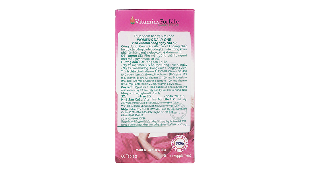 Sản phẩm Women’s Daily One được sản xuất tại Hoa Kỳ theo tiêu chuẩn chất lượng của ngành công nghiệp dược phẩm. Sản phẩm đã được tiêu thụ trên 26 quốc gia trên thế giới.