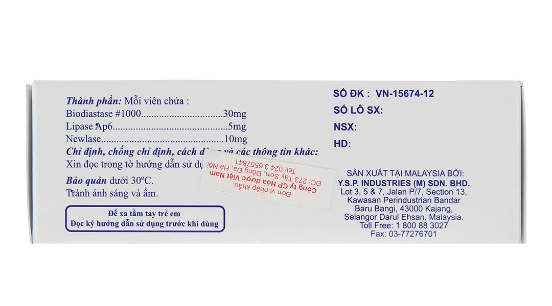 Hoạt chất: Biodiastase #1000 30mg, Lipase Ap6 5mg, Newlase 10mg.