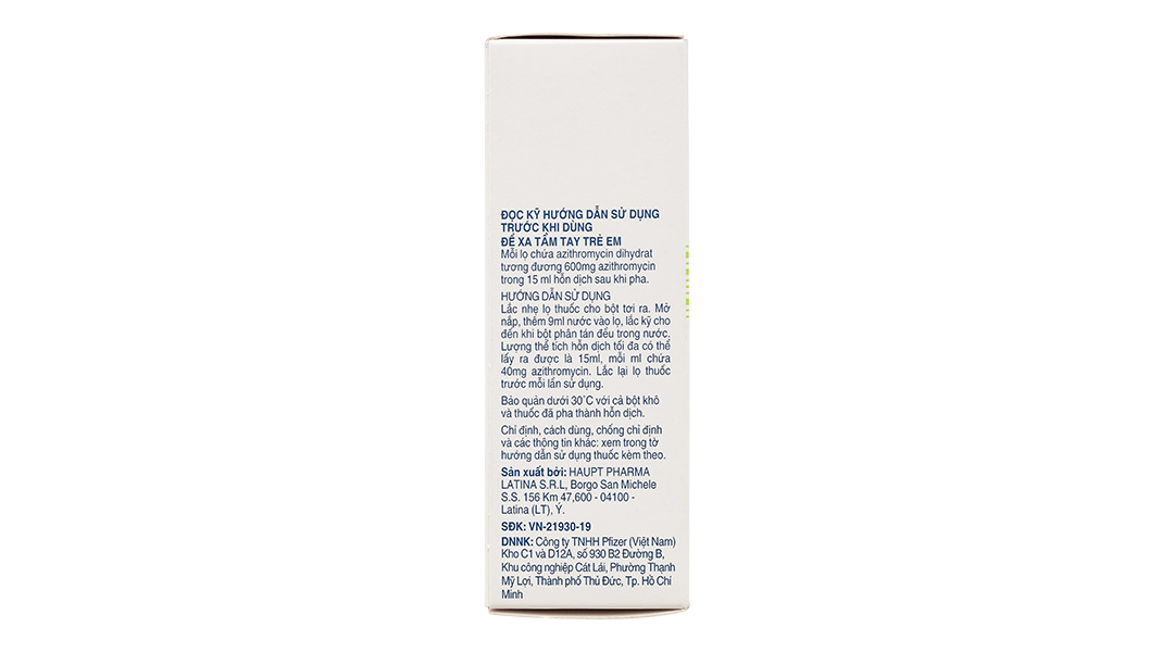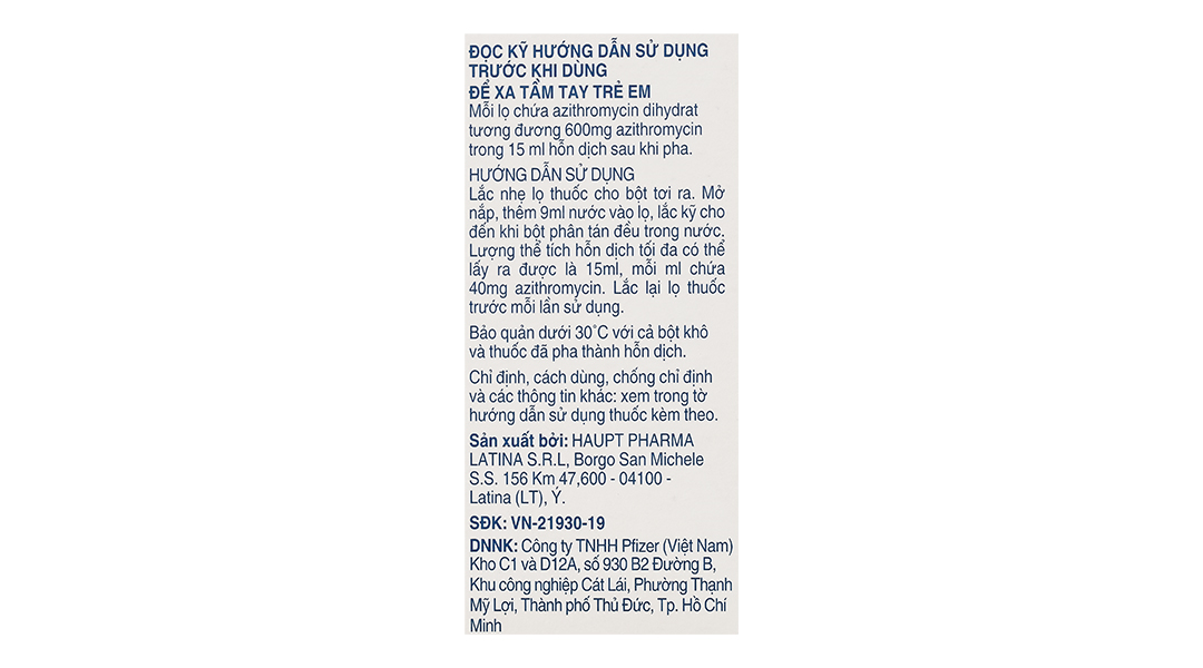 – Thận trọng khi sử dụngQuá mẫn Cũng như với erythromycin và các macrolid khác, đã có báo cáo về các phản ứng dị ứng nghiêm trọng hiếm gặp, bao gồm phù mạch và sốc phản vệ (hiếm khi tử vong), và các phản ứng trên da bao gồm ngoại ban mụn mủ toàn thân cấp tính (Acute Generalized Exanthematous Pustulosis (AGEP)), hội chứng Stevens- Johnson (Stevens-Johnson Syndrome – SJS) và hoại tử biểu bì nhiễm độc (Toxic Epidermal Necrolysis – TEN) (hiếm khi gây tử vong) và phản ứng do thuốc kèm theo tăng bạch cầu ưa eosin và các triệu chứng toàn thân (Drug Reaction with Eosinophilia and Systemic Symptoms-DRESS). Một vài phản ứng với azithromycin đã gây ra những triệu chứng lặp đi lặp lại và đòi hỏi phải được theo dõi và điều trị lâu hơn. Nếu gặp phản ứng dị ứng, cần ngừng ngay thuốc và dùng liệu pháp điều trị phù hợp. Bác sĩ cần biết rằng các phản ứng dị ứng có thể xuất hiện lại khi đã ngừng liệu pháp điều trị triệu chứng. Nhiễm độc gan Vì gan là đường thải trừ chính của azithromycin, nên việc sử dụng azithromycin cần phải thận trọng với những bệnh nhân mắc bệnh gan. Đã có báo cáo về chức năng gan bất thường, viêm gan, vàng da do tắc mật, hoại tử gan và suy gan, một số trường hợp đã gây tử vong. Khi thấy có các dấu hiệu và triệu chứng này, phải ngưng dùng azithromycin ngay lập tức. Hẹp môn vị phì đại ở trẻ sơ sinh (Infantile hypertrophicpyloricstenosis – IHPS) Hẹp môn vị phì đại ở trẻ sơ sinh đã được báo cáo sau khi sử dụng azithromycin ở trẻ chưa đầy 1 tháng tuổi (điều trị kéo dài 42 ngày). Cha mẹ và người chăm sóc trẻ cần liên hệ với bác sĩ nếu trẻ có hiện tượng nôn hoặc bị kích ứng khi ăn. Dùng thuốc có nguồn gốc của lõa mạch(Ergot) Trên những bệnh nhân đang dùng thuốc có nguồn gốc cựa lõa mạch (ergot), khả năng ngộ độc ergotin sẽ tăng lên khi dùng phối hợp với các kháng sinh họ macrolid. Không có dữ liệu về khả năng tương tác giữa của lõa mạch (ergot) và azithromycin. Tuy nhiên, về mặt lý thuyết, có thể xảy ra ngộ độc ergotin, do đó không nên dùng phối hợp các thuốc có nguồn gốc cựa lõa mạch với azithromycin. Bôi nhiễm Cũng như với bất kỳ một kháng sinh nào, cần phải theo dõi các biểu hiện bội nhiễm của vi sinh vật không nhạy cảm, bao gồm cả năm. Tiêu chảy liên quan đến Clostridium difficile Tiêu chảy liên quan đến Clostridium difficile (CDAD) đã được báo cáo khi sử dụng đối với hầu hết các chất kháng khuẩn, bao gồm cả azithromycin, và độ nghiêm trọng có thể dao động từ tiêu chảy nhẹ đến viêm đại tràng dẫn đến tử vong. Điều trị bằng các chất kháng khuẩn sẽ làm thay đổi quần thể vi sinh tự nhiên của ruột dẫn tới sự phát triển quá mức của C.difficile. C.difficile sinh ra độc tố A và B, góp phần làm phát triển CDAD. Các chủng C.difficile sinh nhiều độc tố là nguyên nhân làm tăng tỷ lệ mắc bệnh và tử vong, vì các nhiễm khuẩn này có thể khó chữa khi dùng các liệu pháp kháng sinh và có thể cần phải cắt bỏ đại tràng. Cần phải nghĩ đến CDAD ở tất cả các bệnh nhân xuất hiện tiêu chảy sau khi dùng các thuốc kháng sinh. Cần hỏi kỹ bệnh sử vì đã có báo cáo về CDAD xảy ra tại thời điểm hơn 2 tháng sau khi dùng thuốc kháng sinh. Nên cân nhắc ngưng điều trị bằng azithromycin và sử dụng liệu pháp điều trị đặc hiệu với C. difficile. Suy thận Trên những bệnh nhân suy thận nặng (mức lọc cầu thận < 10ml/phút), quan sát thấy sự tăng 33% nồng độ trong huyết tương của azithromycin (xem mục 5.2 Đặc tính dược động học). Tiểu đường Thân trọng với bệnh nhân tiểu đường: 5ml hỗn dịch đã pha chứa 3,87 g sucrose. Do trong thành phần thuốc có chứa sucrose (3,87 g/5 mi hỗn dịch đã pha), không dùng thuốc cho các bệnh nhân không dung nạp fructose (không dung nạp fructose do di truyền), hấp thu kém glucose – galactose hoặc thiếu hụt enzym saccharase – isomaltase. Kéo dài khoảng QT Kéo dài thời gian rối loạn tái phân cực tim và kéo dài khoảng QT, gây nguy cơ loạn nhịp tim và xoắn đỉnh đã được quan sát thấy khi dùng các macrolid, bao gồm azithromycin (xem mục 4.8 Tác dụng không mong muốn). Các bác sĩ kê toa cần xem xét nguy cơ xuất hiện kéo dài khoảng QT, có thể gây tử vong, khi cân nhắc nguy cơ và lợi ích của azithromycin cho các nhóm đối tượng có nguy cơ cao bao gồm: – Bệnh nhân bị kéo dài khoảng QT bẩm sinh hoặc có tiền sử mắc phải – Bệnh nhân hiện đang dùng các thuốc có tác dụng kéo dài khoảng QT như các thuốc chống loạn nhịp nhóm IA và nhóm III: thuốc chống loạn thần, thuốc chống trầm cảm và fluoroquinolon. – Bệnh nhân bị rối loạn điện giải, đặc biệt trong các trường hợp giảm kali và magie trong máu. – Bệnh nhân bị chậm nhịp tim, loạn nhịp hoặc suy tim. – Người cao tuổi: người cao tuổi có thể nhạy cảm hơn với các tác dụng của thuốc trên khoảng QT. Nhược cơ Đã có báo cáo về sự nặng lên của các triệu chứng nhược cơ ở các bệnh nhân điều tr